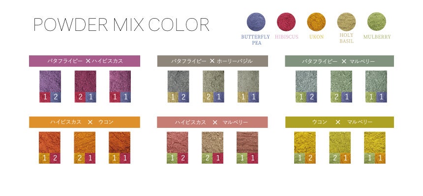 ハーブのパウダー同士を混ぜることで、絵の具のように様々なカラーバリエーションを作り出せます。
