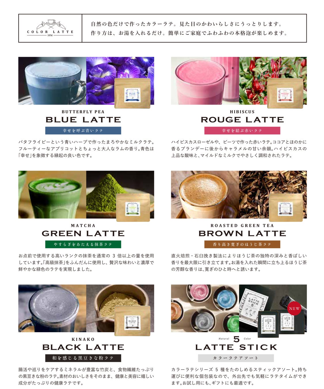 自社農園で農薬、化学肥料を使用せずに栽培したハーブティー、チョコレート専門店と開発した植物油脂不使用のハーブを使った5色のチョコレート、近江茶師と共同開発したこだわりのフワフワ泡のカラーハーブラテなど。
