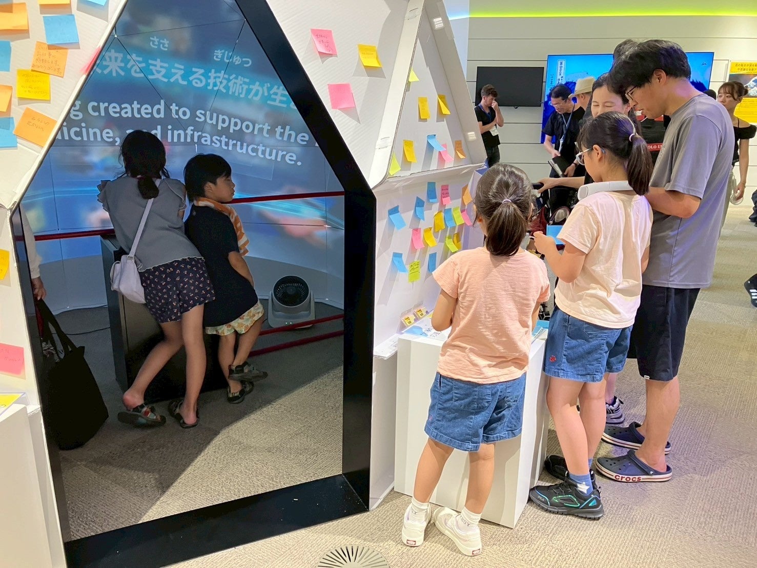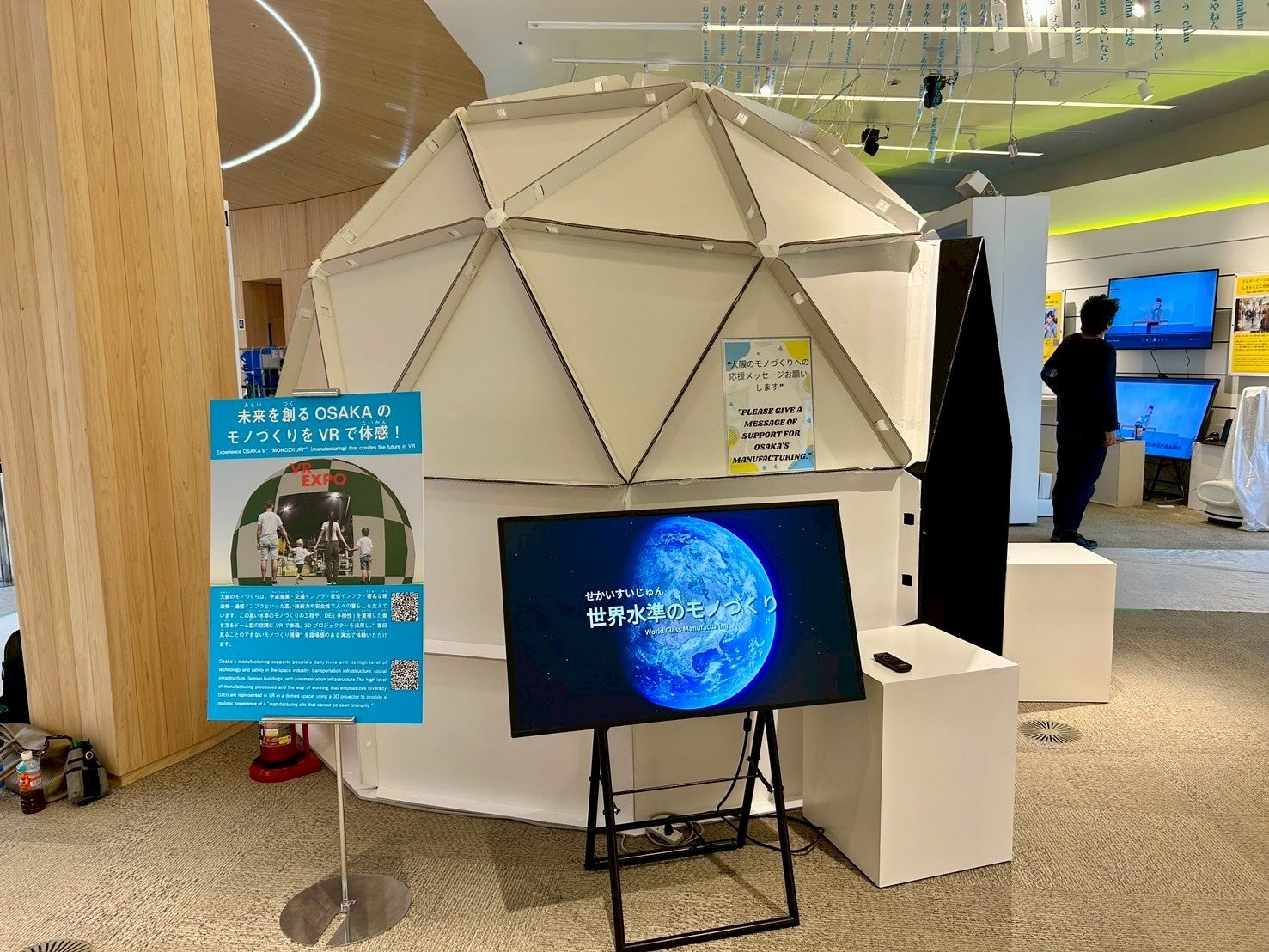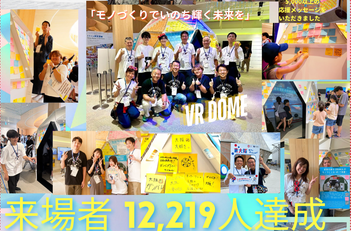 大阪のモノづくりは、宇宙産業・交通インフラ・社会インフラ・著名な建造物・通信インフラといった高い技術力や安全性で人々の暮らしを支えています。この高い水準のモノづくりの工程や、DEI(多様性)を重視した働き方をドーム型の空間にVRで表現。3Dプロジェクターを活用し、"普段見ることのできないモノづくり現場"を臨場感のある演出をしました。最終、12,219人の来場していただきました。