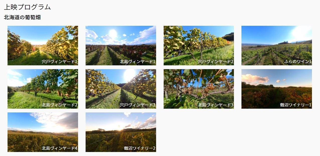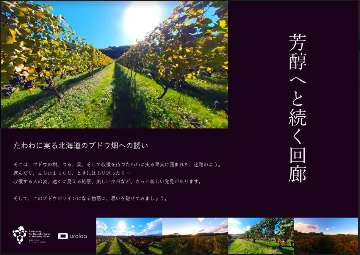北海道ワインのヌーヴェルヴァーグ研究室(北海道大学)との共同企画で、北海道ワインの認知向上・魅力発信を目的に、北海道ワインの生産現場であるブドウ畑を空間型VRにて投影しています。