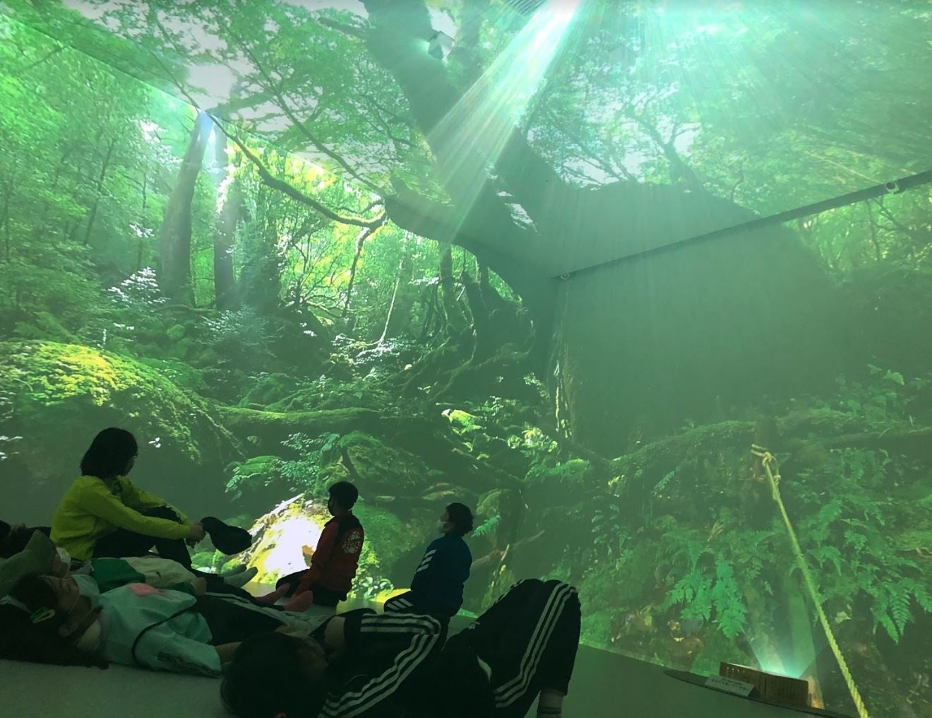 5面の大型マルチスクリーンに十勝の森林や屋久島の天然杉などを映し出し、森の風や木々が揺れる音、複数の天然の木々の香りを再現しあたかも実際に自然にいるような演出を行う日本初(※4)の常設施設です。