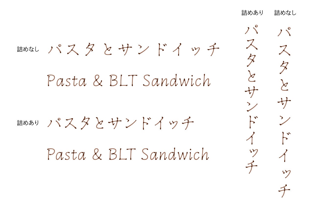 欧文はもちろん、すべての仮名と一部の漢字にメトリクス(詰め情報)を設定しており、文字を打ち込むだけで自然で美しい文字間を再現できます(和文は縦組みにも対応)。