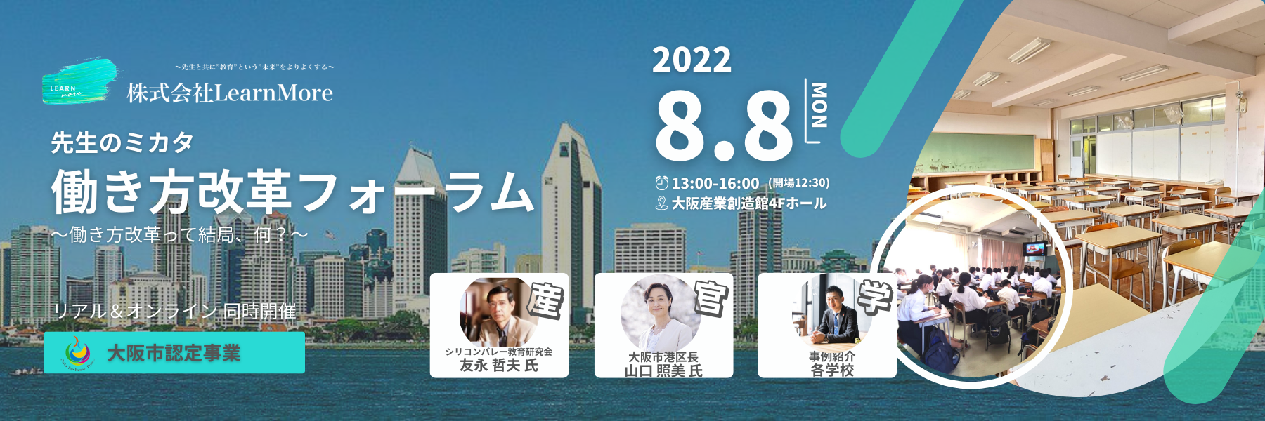 基調講演には大阪市港区長山口様はじめ、シリコンバレー関西ラボ創設者の友永様をお招きします。そして事例紹介として大阪府下各校から担当の先生方にもご登壇いただき、当社がこの2年調査した先生の働き方の現状調査の結果を踏まえてどのような取組みができるのか、2学期からの働き方改革のきっかけとなるようなフォーラムを考えております