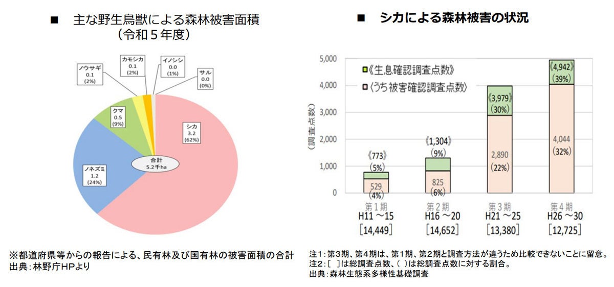 ○令和5年度の野生鳥獣による森林被害面積のうちシカによる被害は約6割を占める。