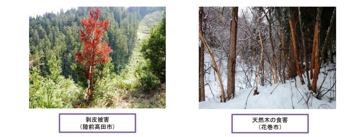 ニホンジカによる食害は、年間を通じて発生している。特徴的な被害として、山林内の植林での剥皮被害や若芽の食害、また水稲の田植後の苗の食害があるほか、野菜類・豆類・水稲等、種類やそれらの各生育段階において、被害状況は多岐にわたり、被害地域も全地域にわたっている。