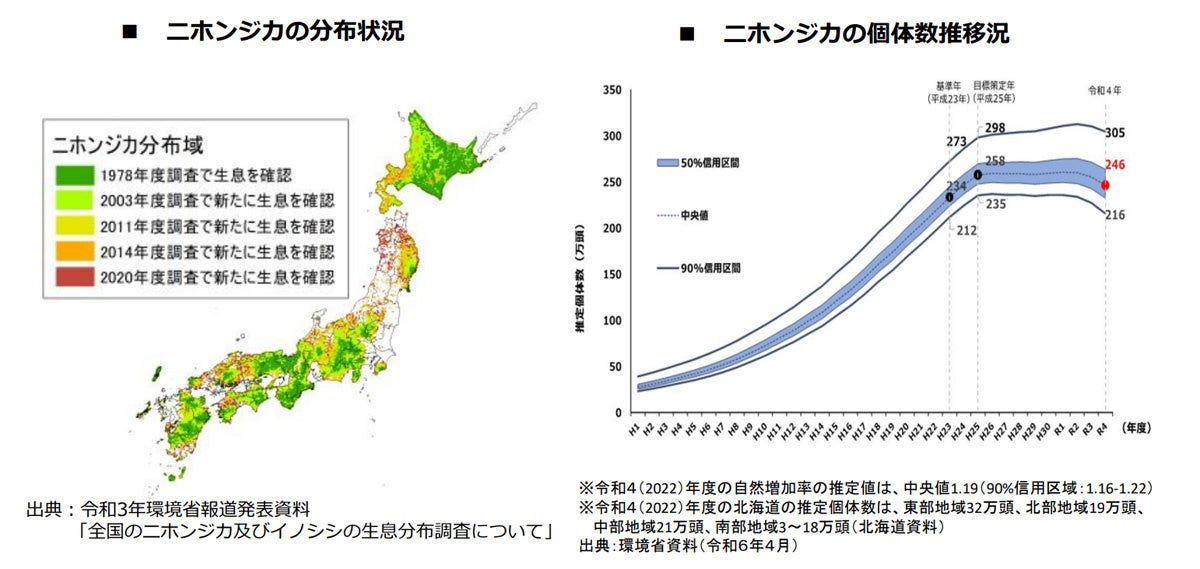 ○環境省の推計では、北海道を除く本州以南には令和4年度末で約246万頭のシカが生息しており、依然として高い水準で推移。