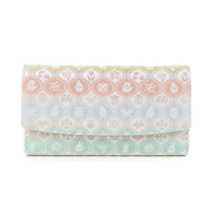 『TATSUMURA × miffy』コラボレーション商品は全て龍村美術織物謹製のオリジナル文様「ミッフィーのたからもの」と「むこうむきミッフィー」の生地を使用しています。世界的な人気キャラクターであるミッフィーのデザインと伝統的な吉祥文様を組み合わせ、クラシカルでありながら、モダンなイメージ、エレガントなエッセンスが加えられた織物に仕上げました。