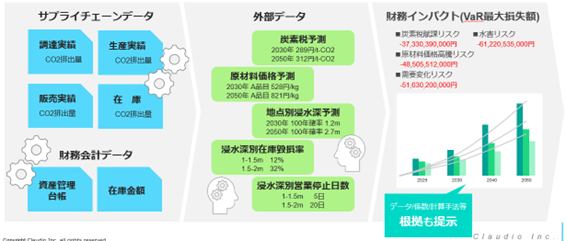 ・特定されたリスクに対して、企業が持つデータと社外の将来予測データをインプットとして事業インパクト