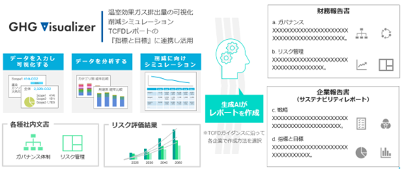 指標と目標で提示するGHG排出量は、アプリケーションに組み込まれたGHGモニタリングツール『GHG Visualizer』から連携して開示データとすることができ、一連のプロセスを1つのサービスとして提供します。