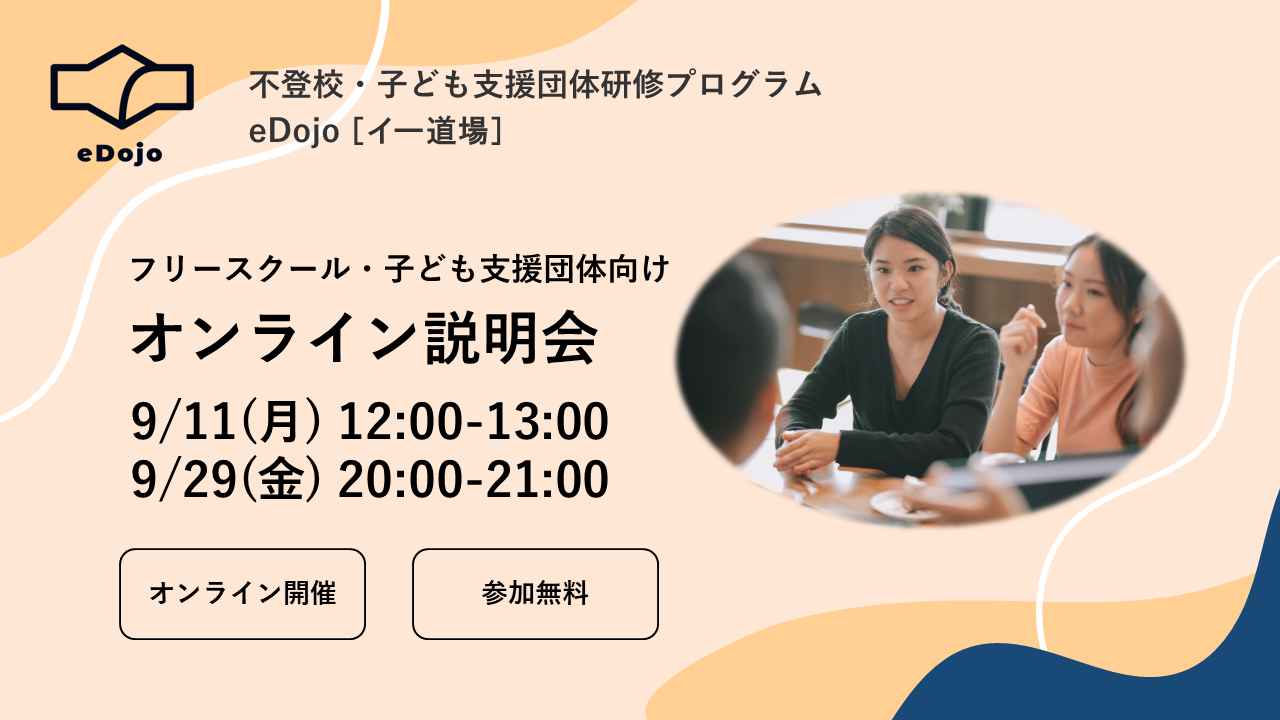 不登校・子ども支援団体研修プログラム eDojo [イー道場]は、2023年6月のスタート以降、現在は約10団体が受講しています。このたびNPO法人eboardは、新たに受講を開始する団体を10団体公募します(参加には、利用料金が必要です)。今回の公募について、下記のとおりオンライン説明会を開催します。eDojoに興味・関心のある団体の参加申込みを受け付けています。