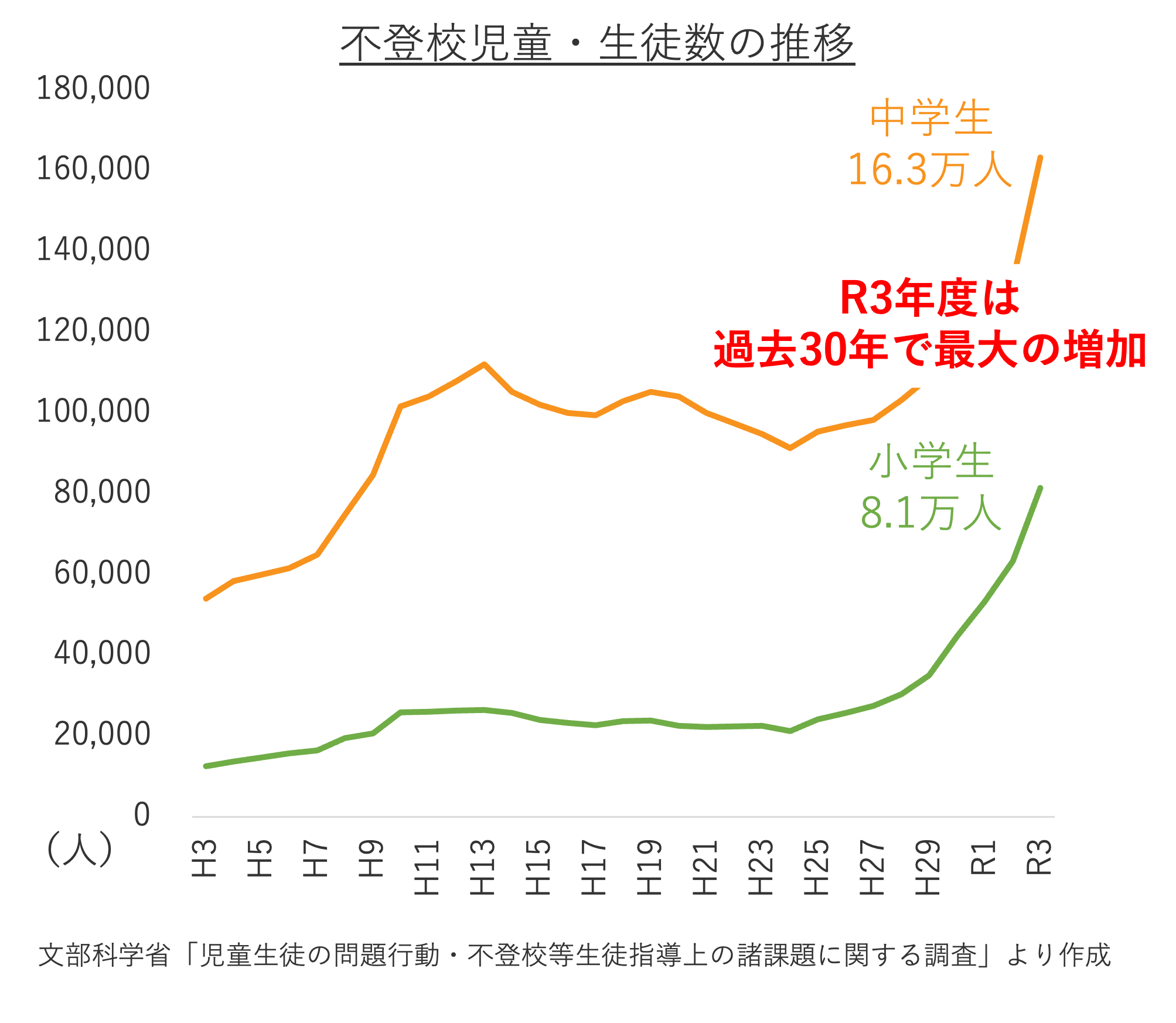 2022年10月に文部科学省から発表された「令和三年度児童生徒の問題行動・不登校等生徒指導上の諸課題に関する調査」では、不登校児童・生徒の数は、過去30年間で最大の4万8,813人増となり、過去最多の24万4,940人に上りました。