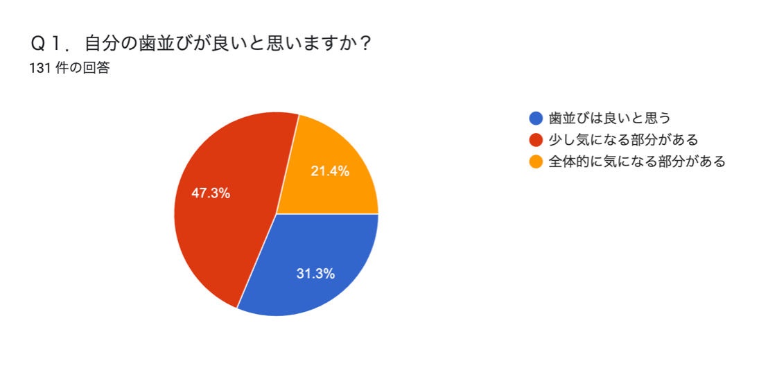 今回の調査により、自分の歯並びに満足している人は約3割で、部分的・全体的に歯並びに気になっている方が約7割もいることがわかりました。