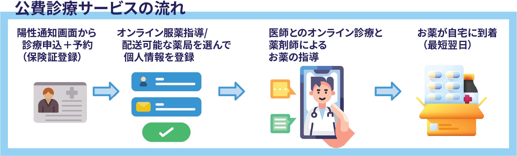 自宅にいながら、オンライン服薬指導を受けられ処方薬の受け取りができます。新型コロナウイルス陽性の場合は、国の公費適応、インフルエンザ陽性の場合は、保険診療にてオンライン診療、診断、処方までサポートを受けられます。