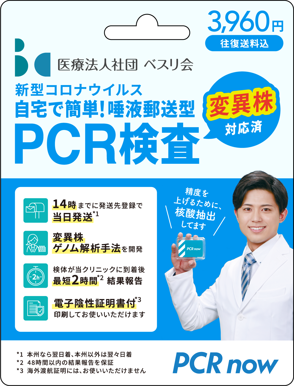 【医療法人社団 ベスリ会 PCR検査カード】は、1月13日より、新型コロナとインフルエンザA型/B型の同時検査を開始いたします。いずれの検査で陽性であった場合でも、オンライン診療を希望された方に診断、必要に応じて処方薬を自宅にお届けします。