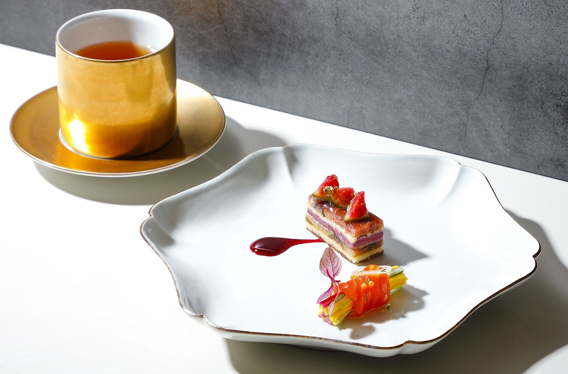 4番目のディッシュは、メインに見立てた近江牛100%のメンチカツと卵黄のコンフィと合わせ、フレッシュな山葵を添えた一皿。濃厚な赤ワインソースとともにご堪能ください。ティーペアリングには長崎玉緑茶とも呼ばれ緑茶独自の苦みや渋みが控えめで、甘味やうまみを感じられるそのぎ茶を合わせました。しっかりとした味わいと香りがコロッケの油分をリセットし、また山葵の爽やかな風味ともマッチするペアリングをお楽しみください。