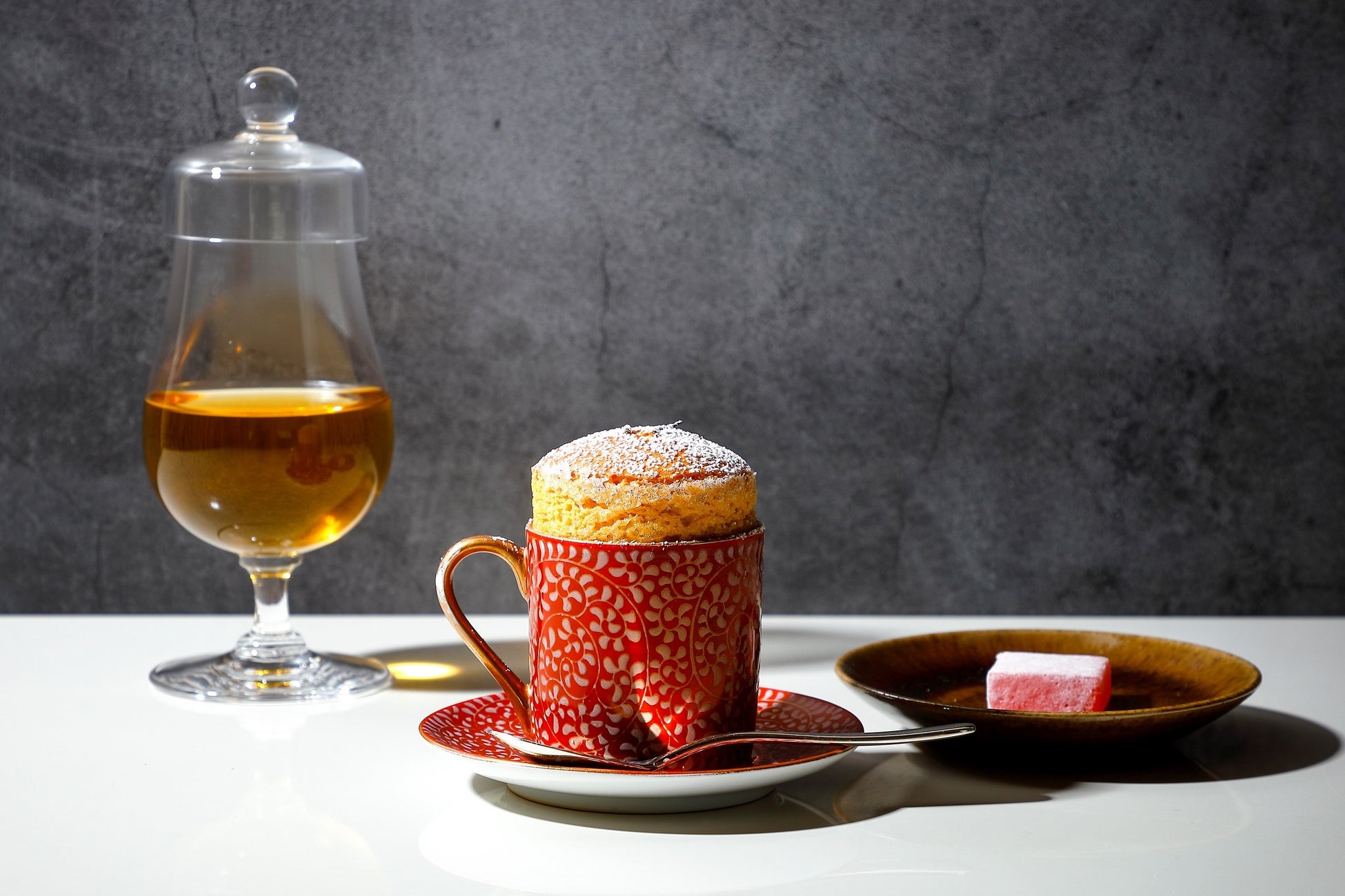 コースの最後を締めくくる6番目のディッシュは、焼きたてでお出しするキャラメルとリンゴのスフレ。ほど良い苦みのキャラメルと紅玉林檎を合わせ、さわやかなりんごのパートドフリュイを添えました。優しくボディのある琉球紅茶をベースに秋らしい金木犀の繊細な香りのブレンドティーは、華やかな香りから始まり、アフターフレーバーは紅茶の甘さが重なり、飲んだ後も長く余韻を残します。