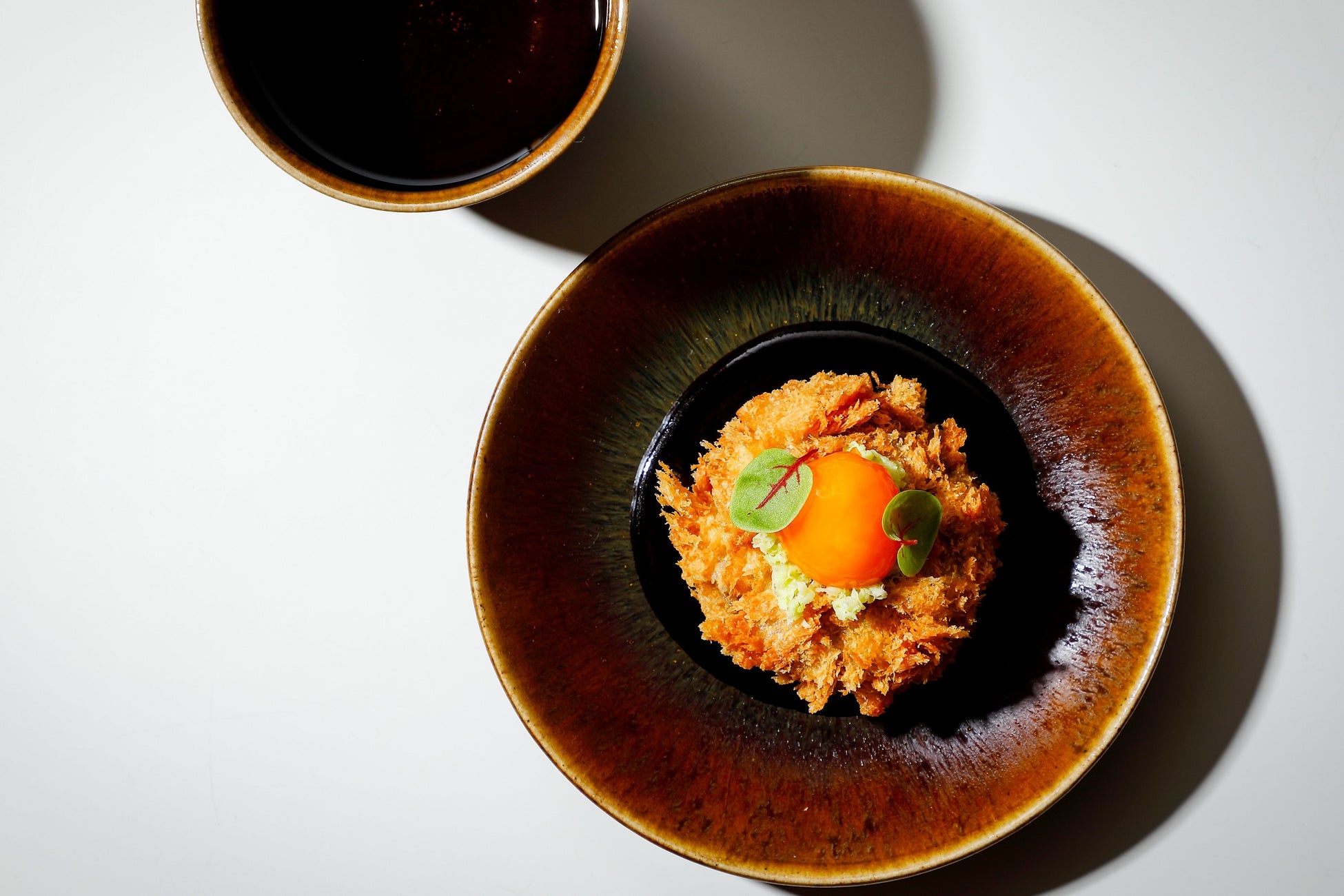 近江牛と山葵のクロケット 卵黄のコンフィ 山葵 / 玉緑茶 アートオブティー 長崎