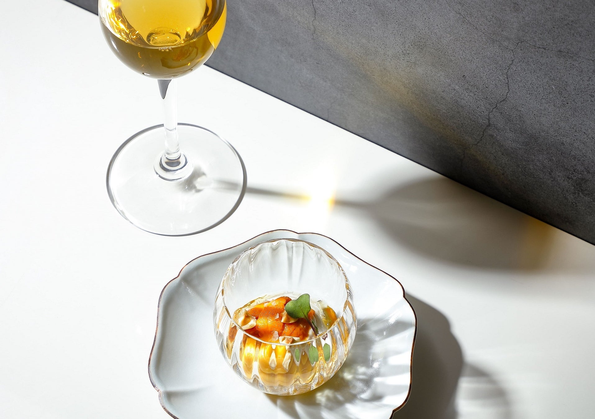 アミューズに見立てた最初のディッシュは、滑らかな南瓜のムース、生雲丹にベーコン風味のシャンティクリームを合わせた一品です。濃厚でクリーミーな味わいに合わせたのは、コールドブリューで抽出することにより黒豆の香ばしい香りや味わいを残しながら、すっきりとした口当たりの京都産黒豆茶です。対照的な味わいのお料理とお茶の組みあわせの妙をお楽しみください。