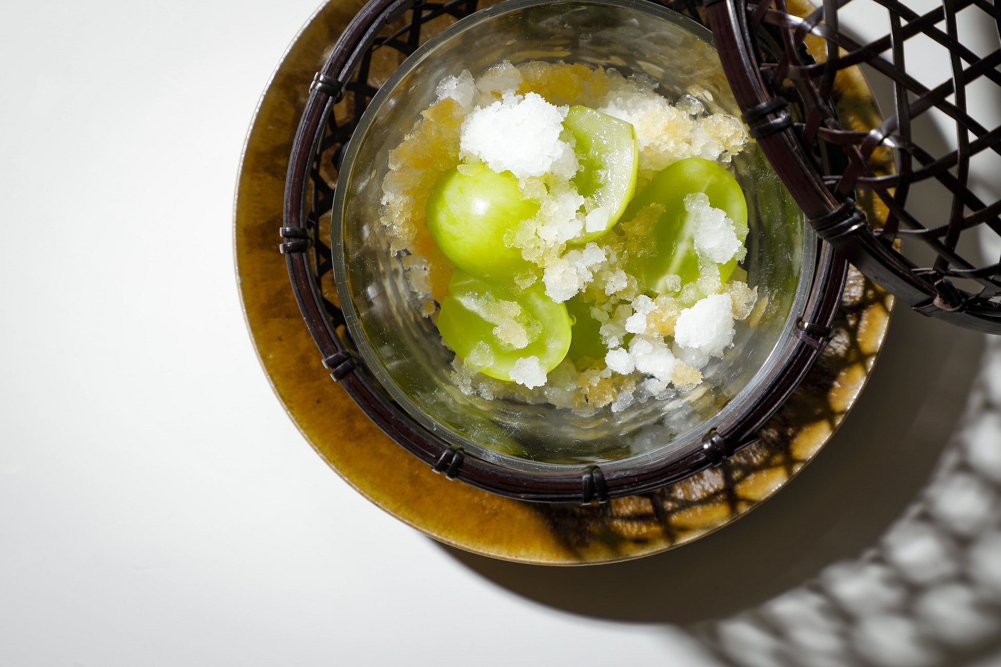 5番目のディッシュは、甘味と酸味のバランスが取れたシャインマスカットにアールグレイ、シャンパーニュの2種類のグラニテでお楽しみください。クロケットの後のお口直しとして、さわやかな風味をお召し上がりください。
