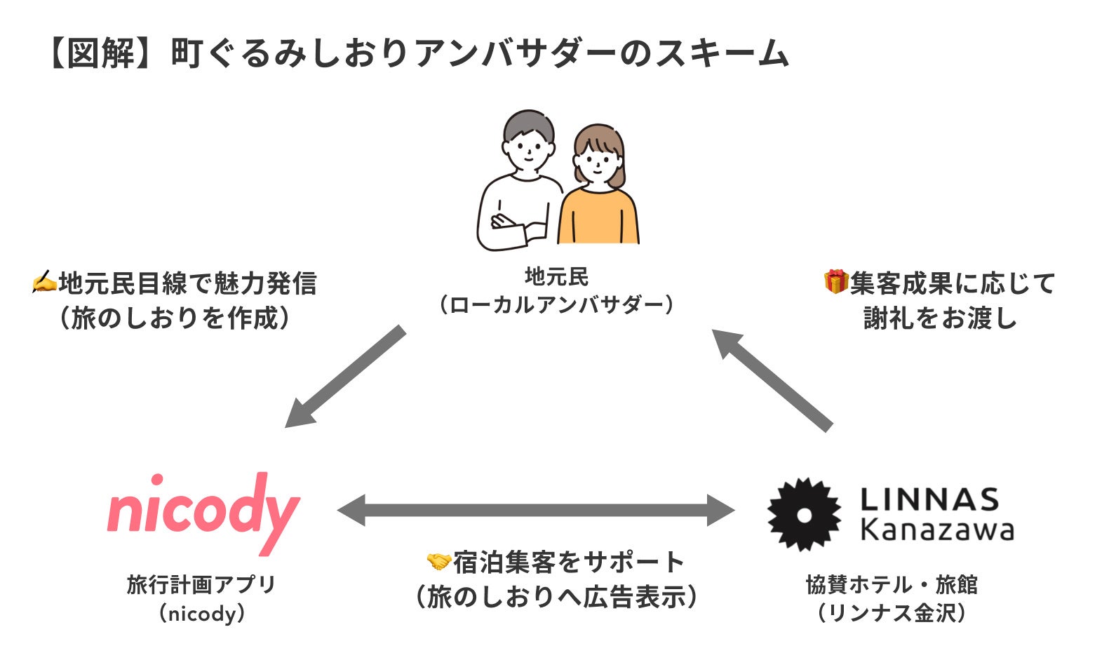 ライフスタイルホテル「LINNAS Kanazawa(リンナスカナザワ)」を運営する株式会社Linnas Design(石川県金沢市、代表取締役 松下秋裕)は、旅行計画アプリ「nicody」を運営する株式会社結.JAPAN様(渋谷区、代表取締役 中山雅久理、以下ニコディ)と連携して、地域の魅力を発信&観光誘致につなげるプロジェクト「町ぐるみしおりアンバサダーin金沢」をスタートいたしました。
