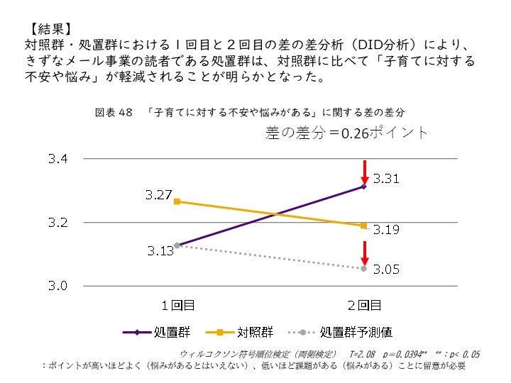 本調査研究では、「港区出産・子育て応援メール配信事業」を利用している区民と、同事業を利用していない子育て中の区民に対して、子育てに関する不安感や考え方、情報取得の方法などについて、計2回の追跡アンケート調査を実施し、両者の調査結果の差から、同事業の効果を検証しました。検証の中で、不安軽減に効果があること確認できました。
