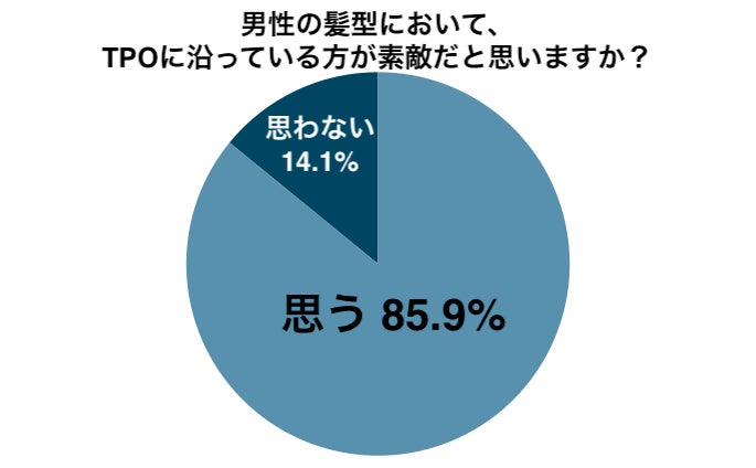 「男性の髪型において、TPOに沿っている方が素敵だと思いますか?」と質問したところ、85.9%の方が「思う」と回答し、多くの女性が男性の髪型においてTPOを重視していることがわかりました。