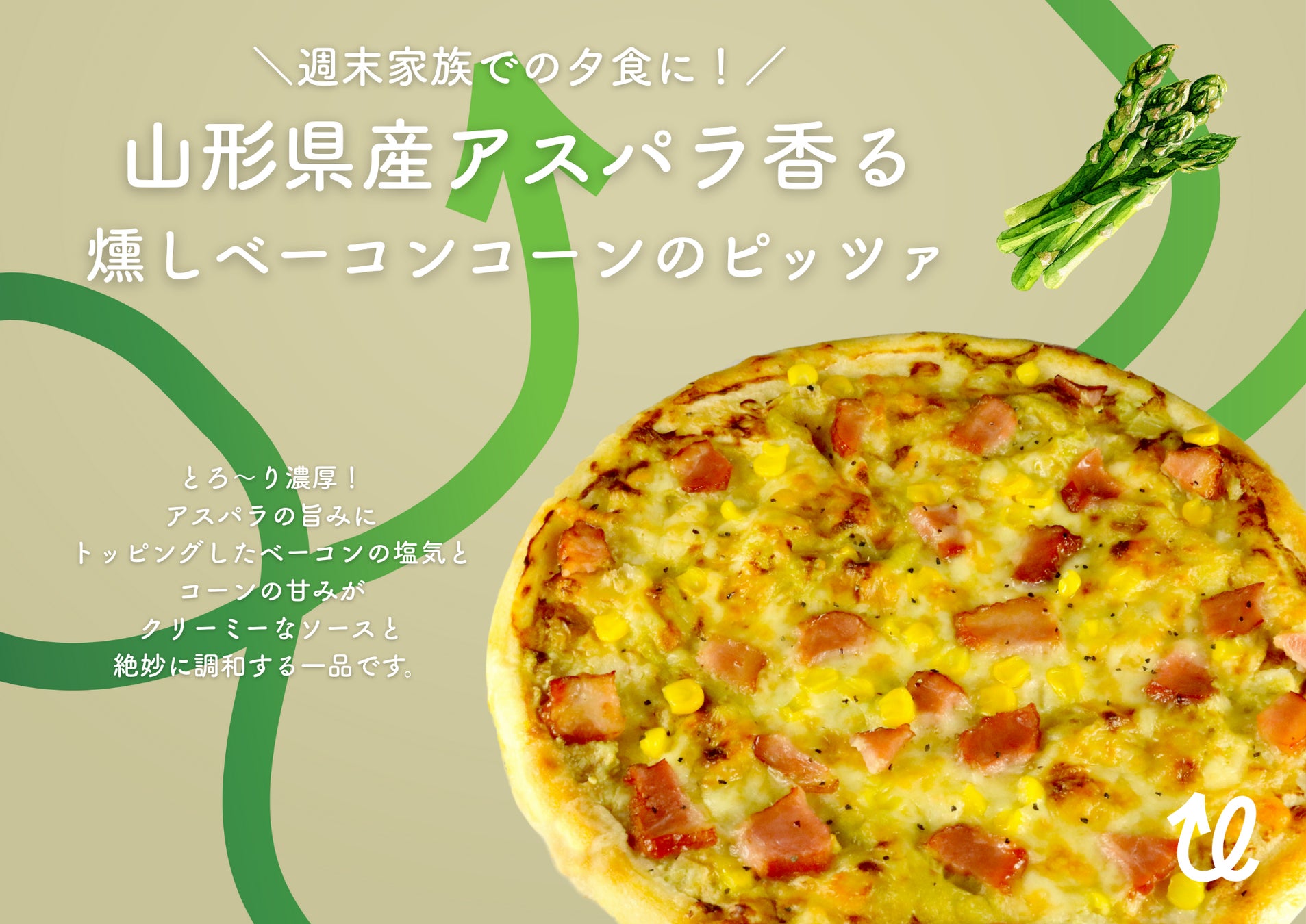 アスパラガス粉末をクリーミーなグラタンソースにあわせたピザです。燻しベーコンの塩気とコーンの甘みが絶妙なアクセント。お子さまから大人まで楽しめる、満足感たっぷりの一品です。