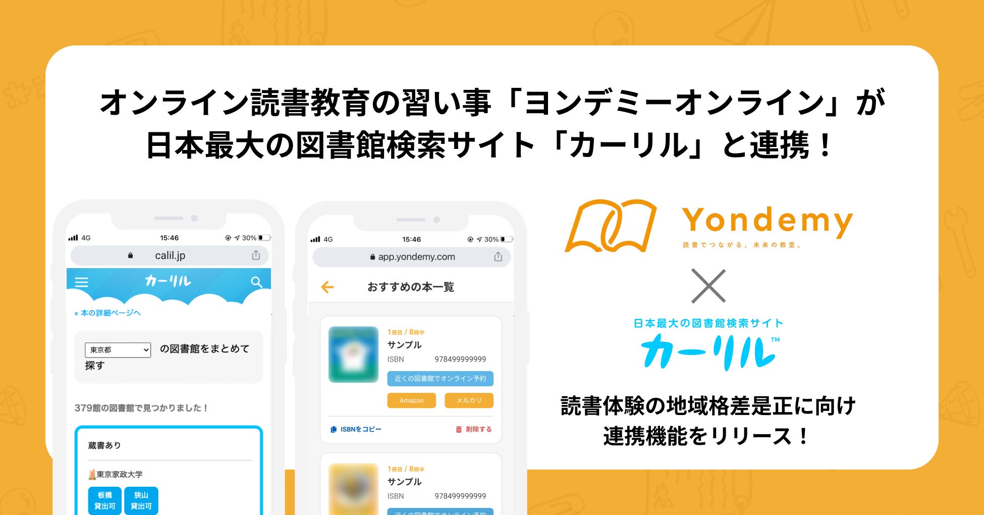 オンライン読書教育の習い事「ヨンデミーオンライン」を運営する株式会社Yondemy(本社:東京都渋谷区、代表取締役:笹沼 颯太、以下「当社」)と、全国の図書館を対象としたリアルタイム蔵書検索を可能にするAPI「図書館 API」を運営する株式会社カーリル(本社:岐阜県中津川市、代表取締役:吉本龍司)は「連携・協力に関する協定書」を締結いたしました。また、本協定を起点として、「ヨンデミーオンライン」が「図書館 API」に接続し、全国の図書館を対象としたリアルタイム蔵書検索を行うことで、ユーザーが指定した図書館で借りられる・取り寄せられる本を優先しておすすめできる機能をリリースいたしました。本機能によって居住地域の図書館の蔵書による教育機会の制限を改善するとともに、今後も教育における地域格差を是正するための取り組みを進めてまいります。