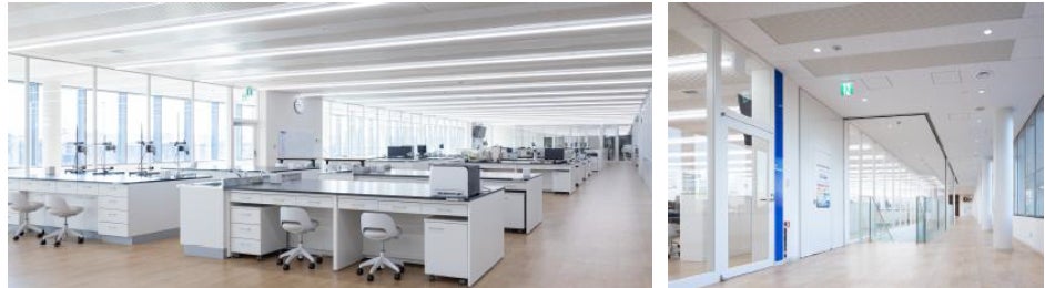 キミカ本館は、株式会社類設計室の斎藤裕一氏、米澤星矢氏、渡邉光太郎氏らが設計を手掛け、建物中央のクロス階段とオープンラボにパイロシステム社製のガラス耐火間仕切りが採用されています。ラボの東側全面をガラス耐火間仕切りでガラス張りにすることにより、ラボ、クロス階段、緑豊かな景観が一体化し、明るく見晴らしがよいと同時に災害時の安全な避難経路も確保しました。一般的に、閉鎖的な空間となることが多いラボですが、ガラス耐火間仕切りの活用とレイアウトや空調システムなどを工夫することで開放的で安全な空間デザインを実現しました。