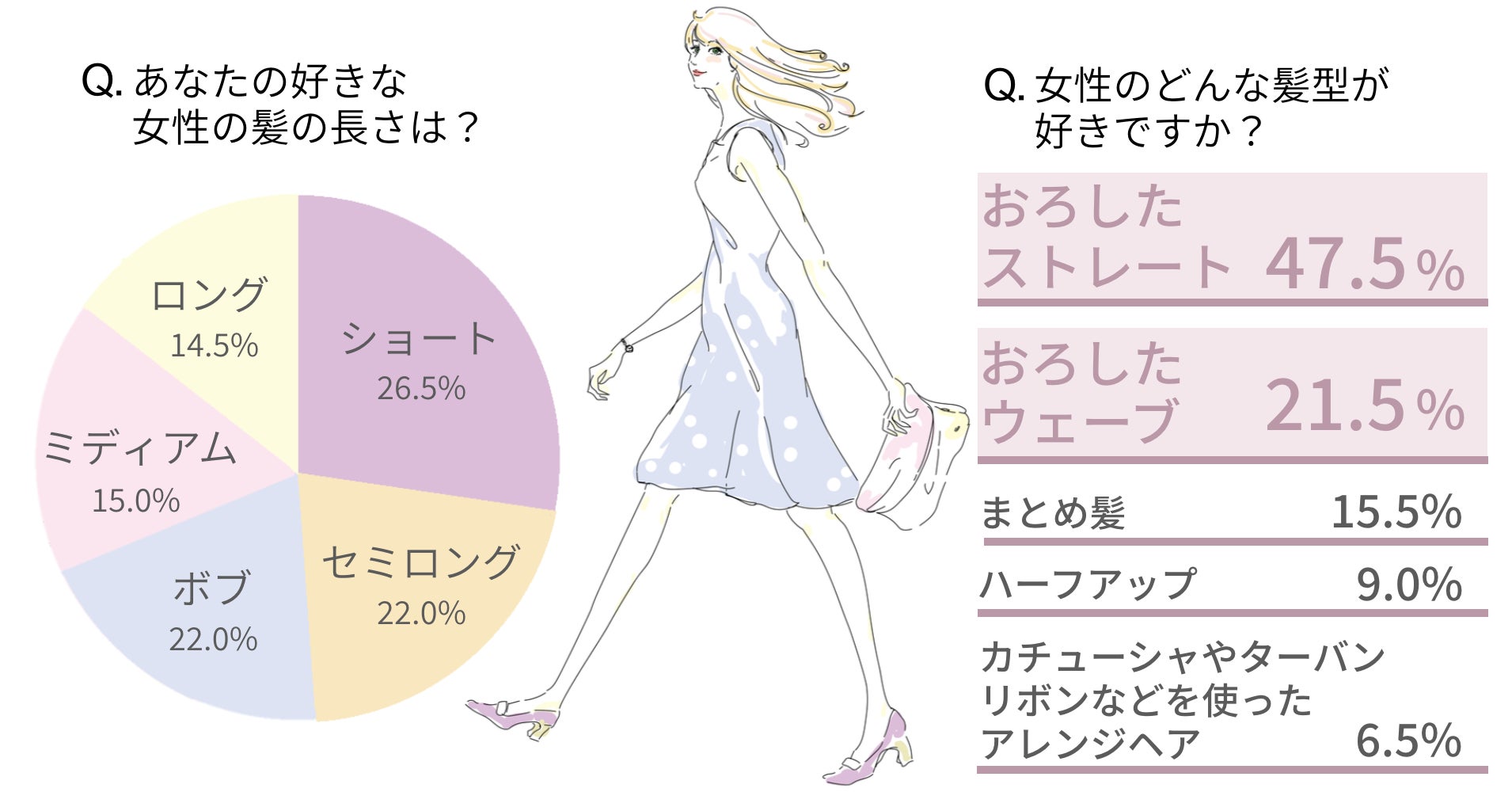 「好きな髪の長さ」や「好きなヘアスタイル」は下記のとおり。思っていた以上に、好みもさまざまです。