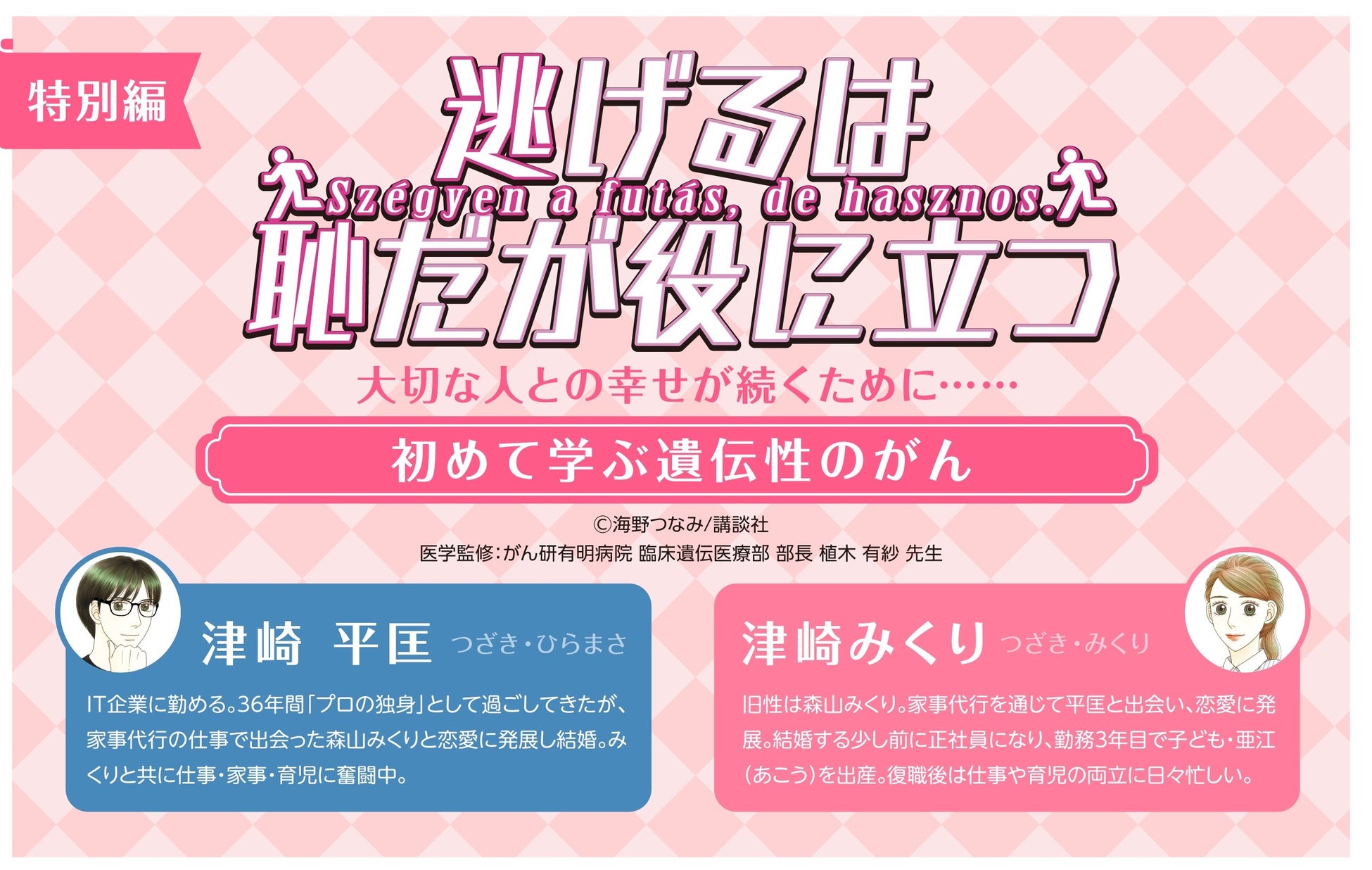 海野つなみ先生の大人気作品「逃げるは恥だが役に立つ」の特別編「~大切な人との幸せが続くために……初めて学ぶ遺伝性のがん~」を本日より期間限定で掲載開始