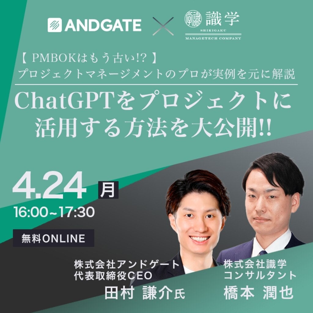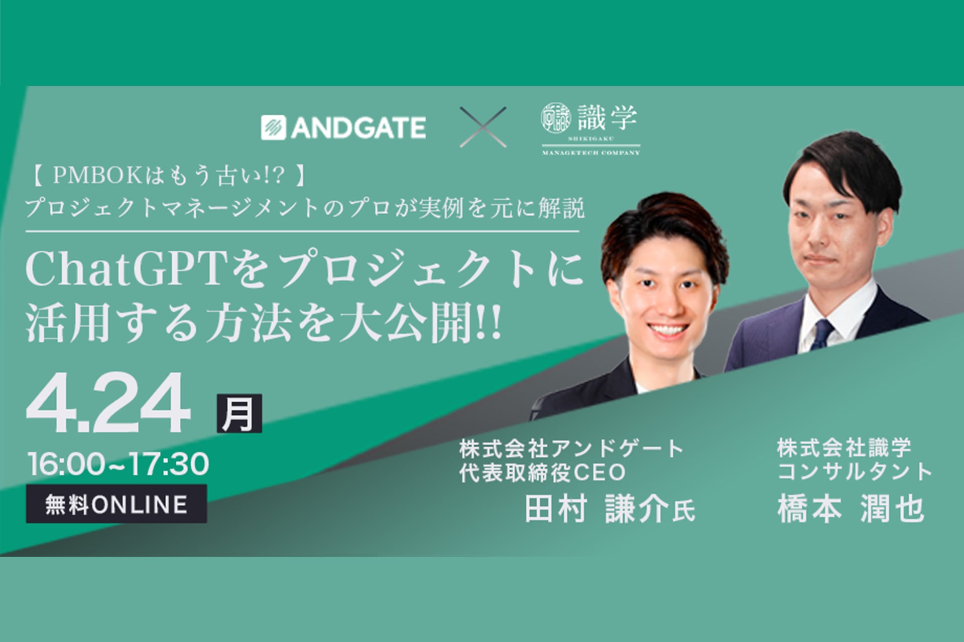 マネージメントコンサルタントの株式会社識学とプロジェクトマネージメント支援の株式会社アンドゲートが共催で無料WEBセミナー【 PMBOKはもう古い!? 】プロジェクトマネージメントのプロが実例を元に解説ChatGPTをプロジェクトに活用する方法を大公開!!を開催いたします。