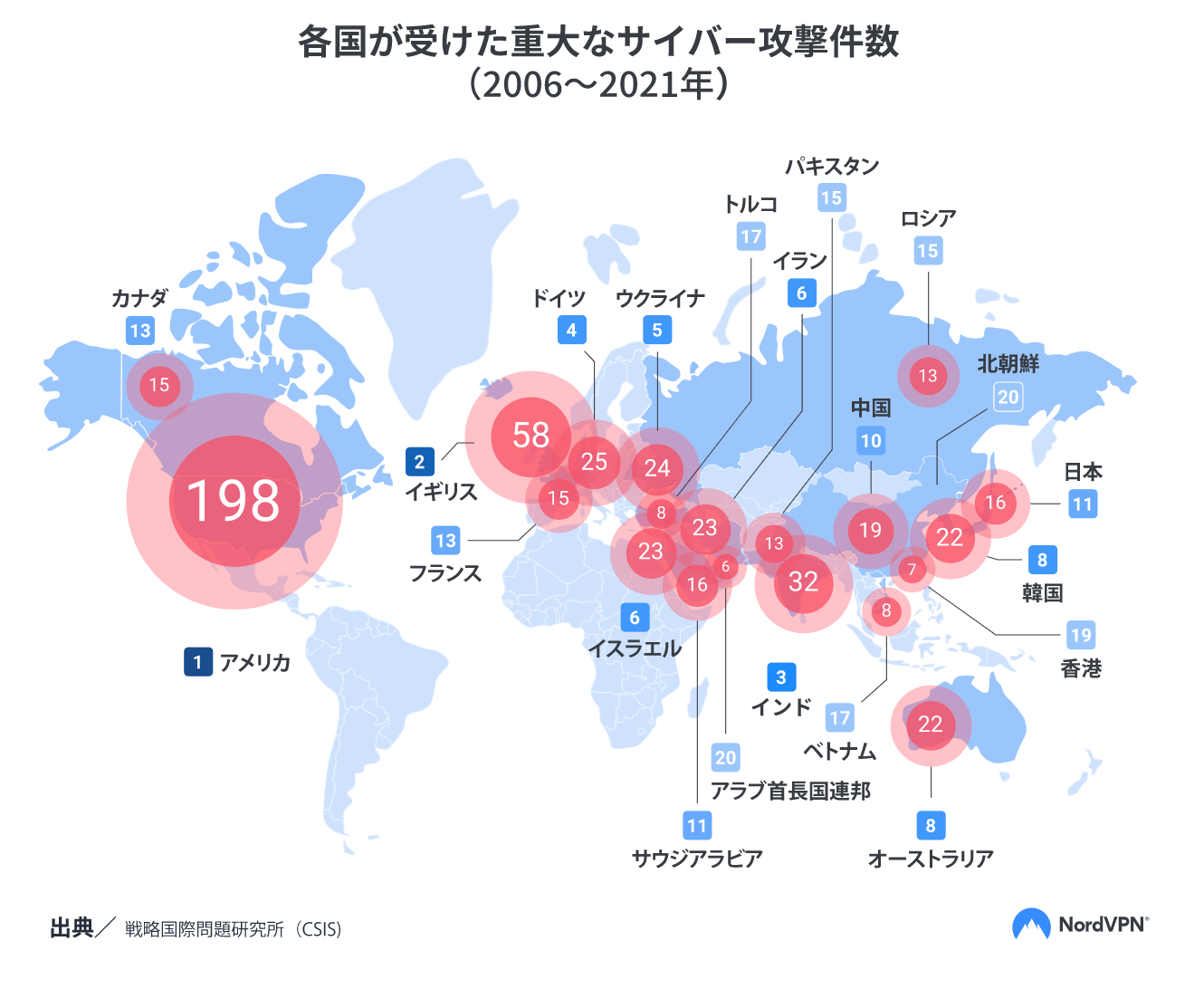 以上をまとめると、最も深刻なサイバー攻撃を受けた国には、敵対する国家があり、国家が支援する強力なハッカー集団から多くの攻撃を受けている可能性が高いと言えます。西側諸国以外で強力な国家支援型ハッカー集団を有している国は、中国、ロシア、イラン、北朝鮮のほか、パキスタン、ベトナム、トルコなどが挙げられます。より詳しい情報を確認したい方は、こちらのページ [https://nordvpn.com/ja/blog/cyber-attack-incidents/] をご覧ください。