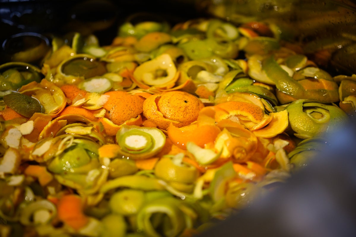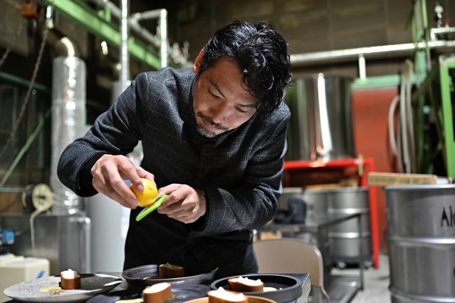 今回のスイーツに使用したのは、2023年11月下旬に日本各地でで収穫された5種類の柑橘(ベルガモット・ネーブルオレンジなど)、それに9種類のボタニカルを加えて蒸留したオレンジスピリッツ。2023年12月に、籏シェフらが柑橘の皮を1つずつ丁寧にむき、蒸留を手伝ったものになります。
