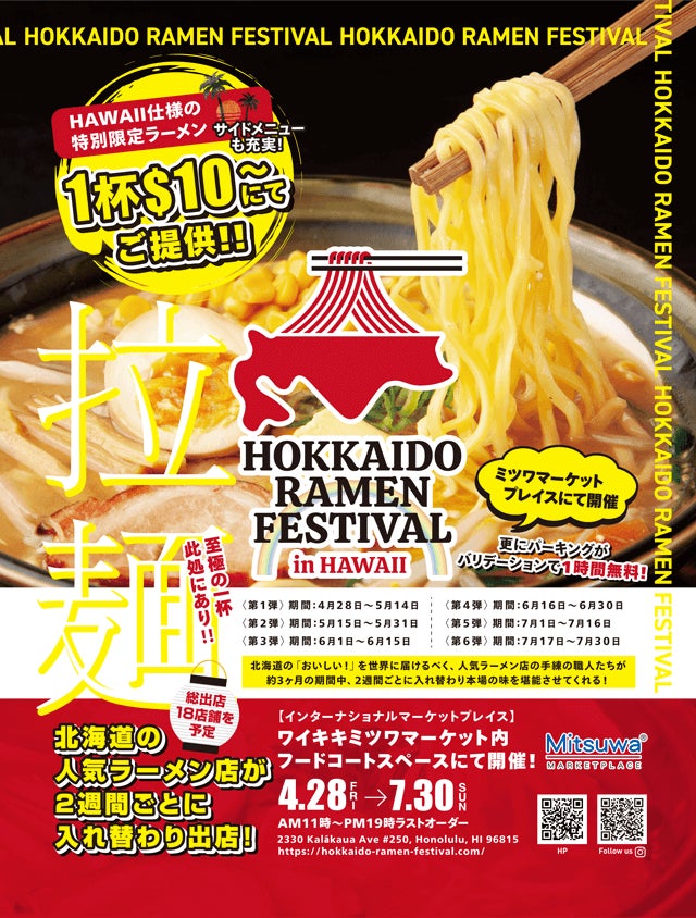 【北海道ラーメンフェスティバル in Hawaii 】開催決定!! 北海道各地の人気ラーメン店がハワイに集結!! 2週間ごとに店舗が入れ替わり全18店舗が出店!