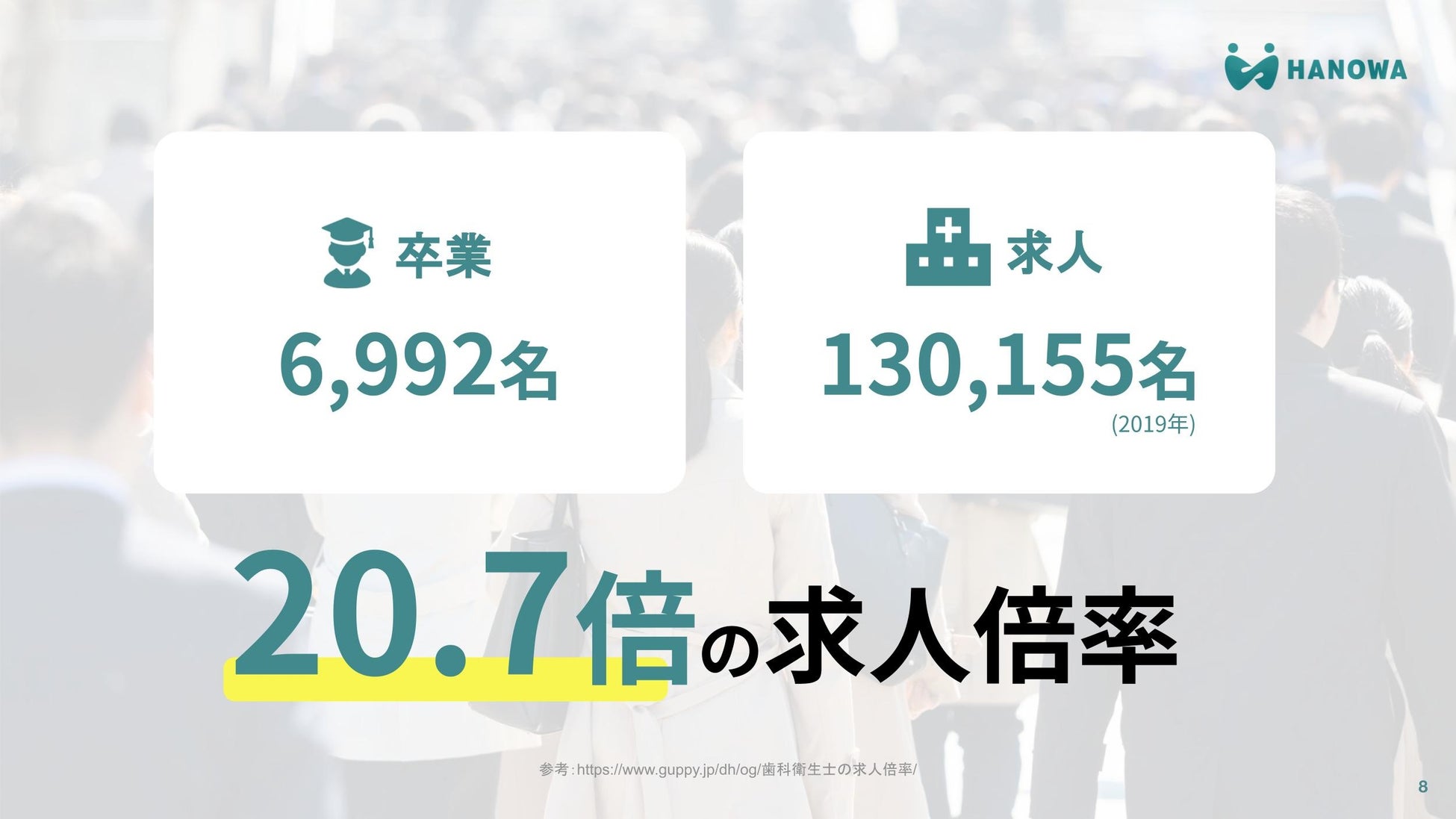 HANOWAは、地域の歯科医療従事者のスキマ時間を共有し、歯科医院と歯科医療従事者をつなぐマッチングプラットフォームです。歯科医療従事者は、働きたい日時だけ働くことができ、自分で時給を提示することができます。 歯科医院は、来て欲しい日時に地域の歯科医療従事者へ仕事のオファーができ、固定費を抱えることなく人員を確保することができます。現在は、登録歯科医院数3,500医院、登録歯科医療人材数10,000人、累計マッチング件数36,000件のサービスとして成長し、多様な歯科医院・歯科医療従事者のみなさまにご利用いただいています。