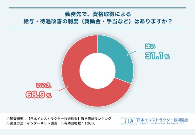 そこで「勤務先で、資格取得による給与・待遇改善の制度(奨励金・手当など)はありますか?」と質問したところ、『はい』が31.1%、『いいえ』が68.9%という結果となりました。