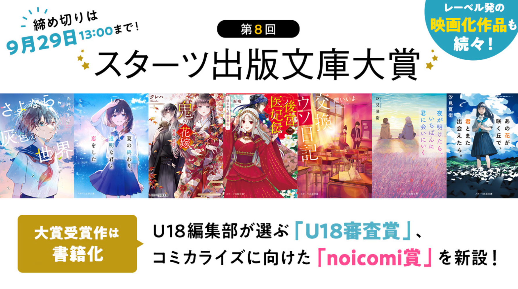 今年で第8回目となる「スターツ出版文庫大賞」の募集は、2023 年7 月28 日(金)よりスタートいたします。募集部門は「青春・恋愛]「あやかし・和風ファンタジー」「後宮ファンタジー」「フリーテーマ」の4部門。大賞受賞作品は書籍化いたします。今年はレーベルのターゲット世代である18 歳以下の中高生で構成する「U18 編集部」が審査に参加、彼らが選ぶ「U18 審査賞」を新設。また、「noicomi 賞」に選出された作品は、コミカライズを検討いたします。