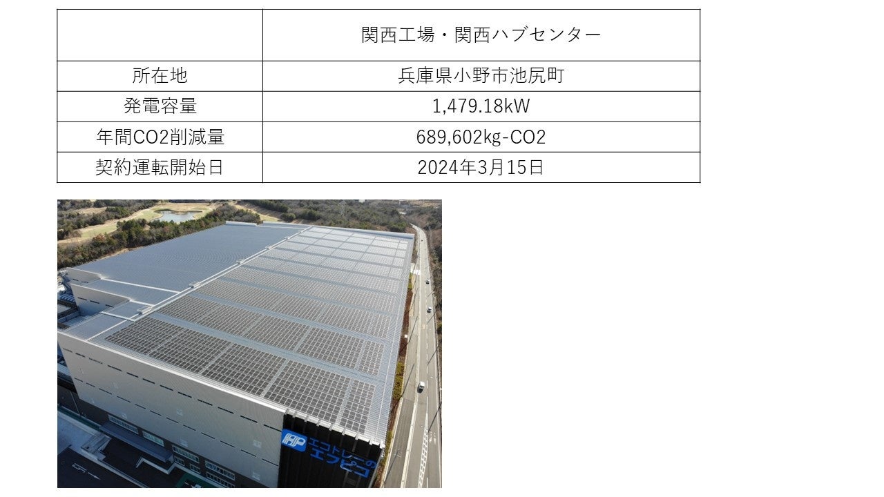 三井物産プラントシステム株式会社(本社:東京都港区、代表取締役社長:谷垣匡輝、以下「MPS」)は、株式会社エフピコ(本社:東京都新宿区、代表取締役会長:佐藤守正、以下「エフピコ」)の関西工場・関西ハブセンターの屋根上に設置を進めていた太陽光発電所を2024年3月15日に完工し、商業運転を開始しました。この設備は2023年4月27日付「株式会社エフピコとの関西工場・関西ハブセンター屋根上太陽光発電所の電力購入契約(PPA)を締結」にて公表した電力購入契約(以下「PPA」、*1)に基づくものです。
