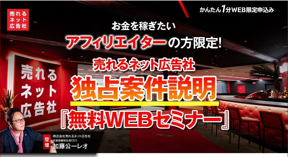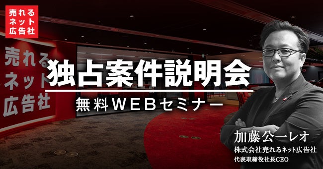 「ネット通販(D2C)」×「ネット広告」に特化したクラウドサービスおよびコンサルティングサービスを提供する売れるネット広告社(代表取締役社長 CEO:加藤公一レオ、本社:福岡県福岡市)は、2022年3月31日(木)からアフィリエイター向け独占案件説明『無料WEBセミナー』を毎週開催いたします。
