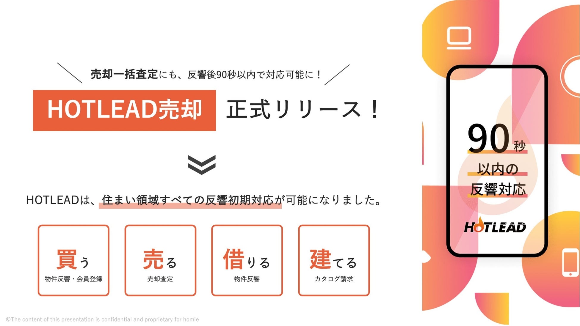 住宅・不動産営業DX支援事業を展開するhomie株式会社(本社:東京都渋谷区、代表取締役:村上靖知) は、2024年3月にHOTLEAD売却を正式リリースいたします。これにより、反響対応コンシェルジュサービス「HOTLEAD」は、買う・借りる・建てる・売るという住まい領域全ての顧客対応が可能になります。2020年6月のサービス提供開始以降、累計約60万件の反響対応・約10万件のアポイント創出を通し、媒体(自社HPやポータルサイト)毎や領域(買う・借りる・建てる・売る)毎の顧客像の理解を深め、それぞれの顧客ニーズを汲み取った適切なコミュニケーションを磨いてまいりました。これからも、買いたい・売りたい・建てたい・借りたいというお客様の想いを汲み取り、住宅・不動産営業との出会いを創出すると同時に、導入企業各社と協業し、お客様のニーズに沿った最適な接客対応・接客体制を模索し、接客の質向上を目指してまいります。