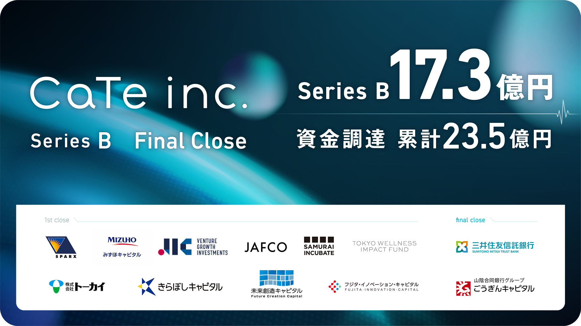 株式会社CaTe(本社:東京都文京区、代表取締役:寺嶋 一裕、以下「CaTe」)は、2025年11月、シリーズBラウンド Final Closeとして、三井住友信託銀行株式会社、ごうぎんご縁結び1号投資事業有限責任組合(ごうぎんキャピタル株式会社)を引受先とした第三者割当増資により、追加の資金調達を実施しました。