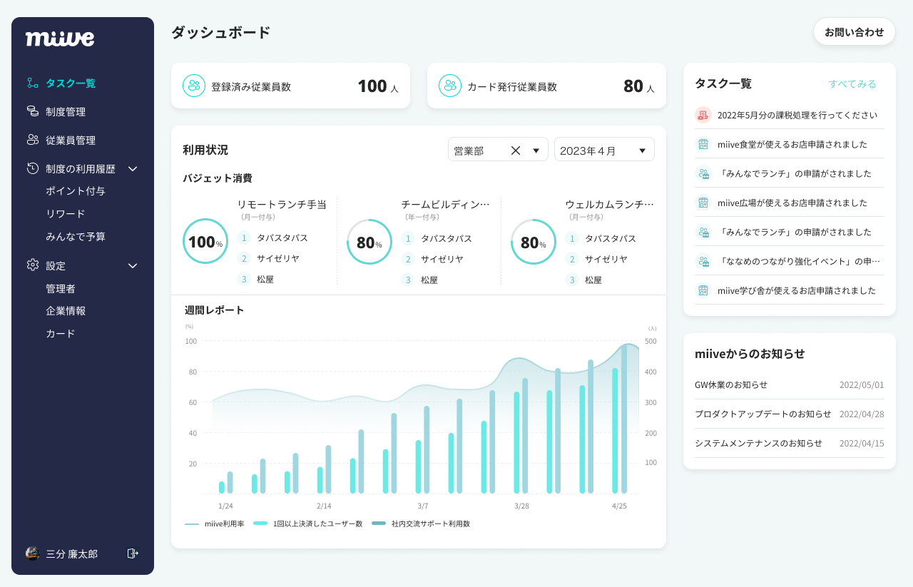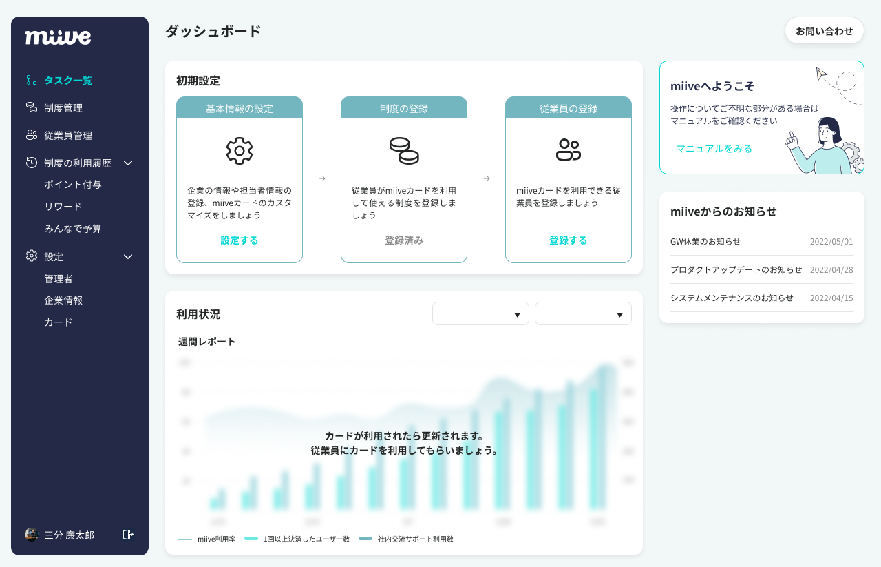 カード型福利厚生制度運用SaaS「miive」、ダッシュボード機能をリリース