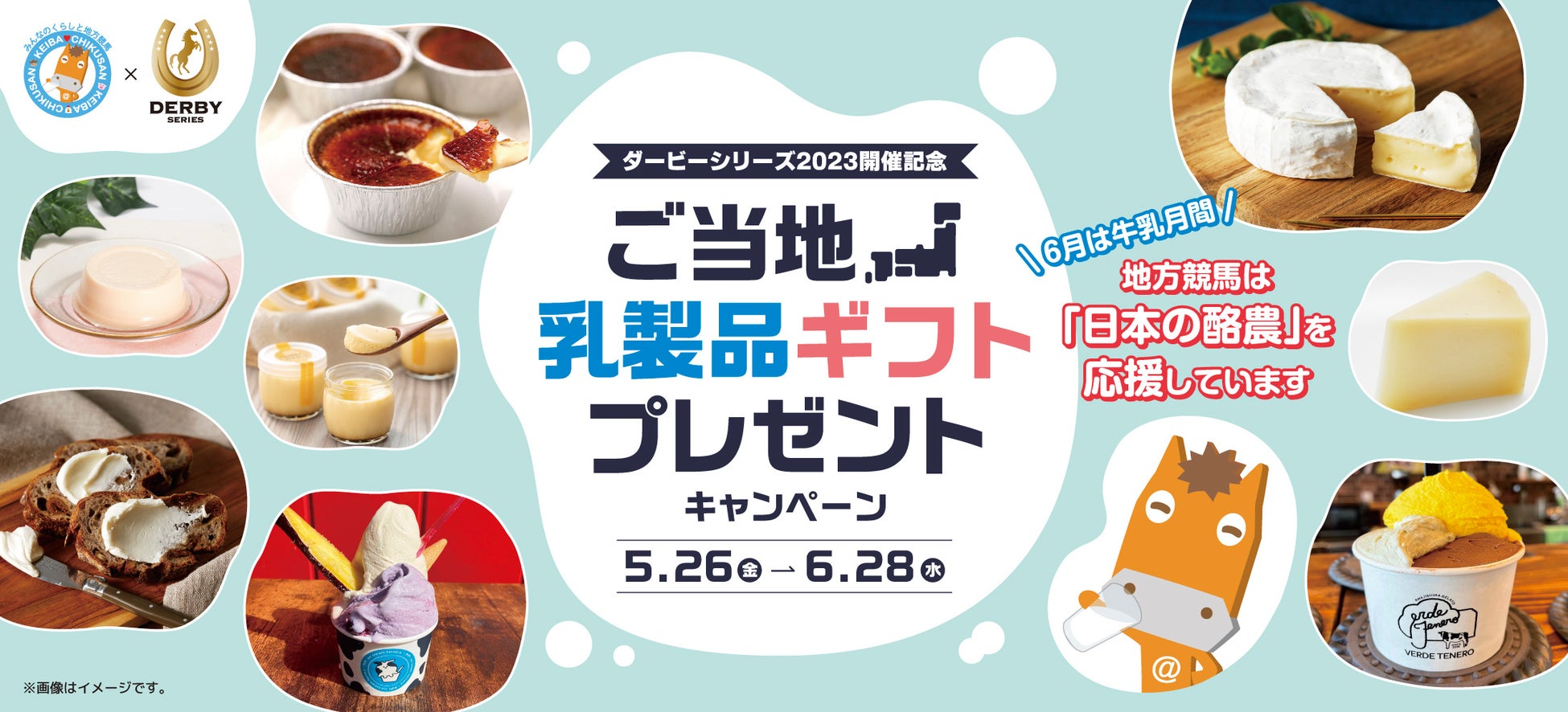 馬事畜産振興協議会(事務局:公益社団法人中央畜産会)は、地方競馬全国協会の補助事業により、畜産振興の一環として『ダービーシリーズ2023開催記念 ご当地乳製品ギフトプレゼントキャンペーン』を下記のとおり実施することとなりました。