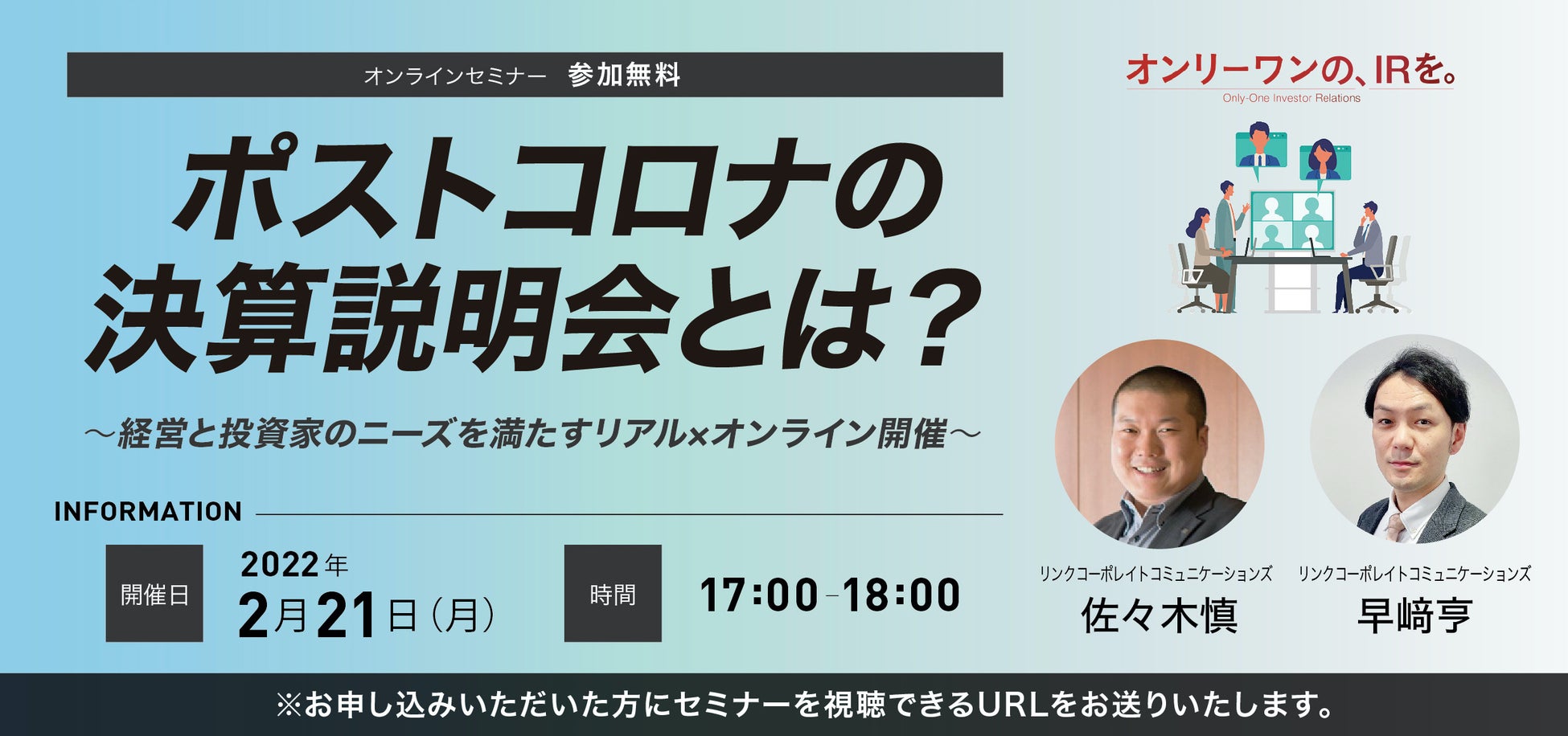 企業のIR領域を支援する株式会社リンクコーポレイトコミュニケーションズ(本社:東京都中央区 代表:白藤大仁)は、「ポストコロナの決算説明会」をテーマに無料WEBセミナーを開催します。
