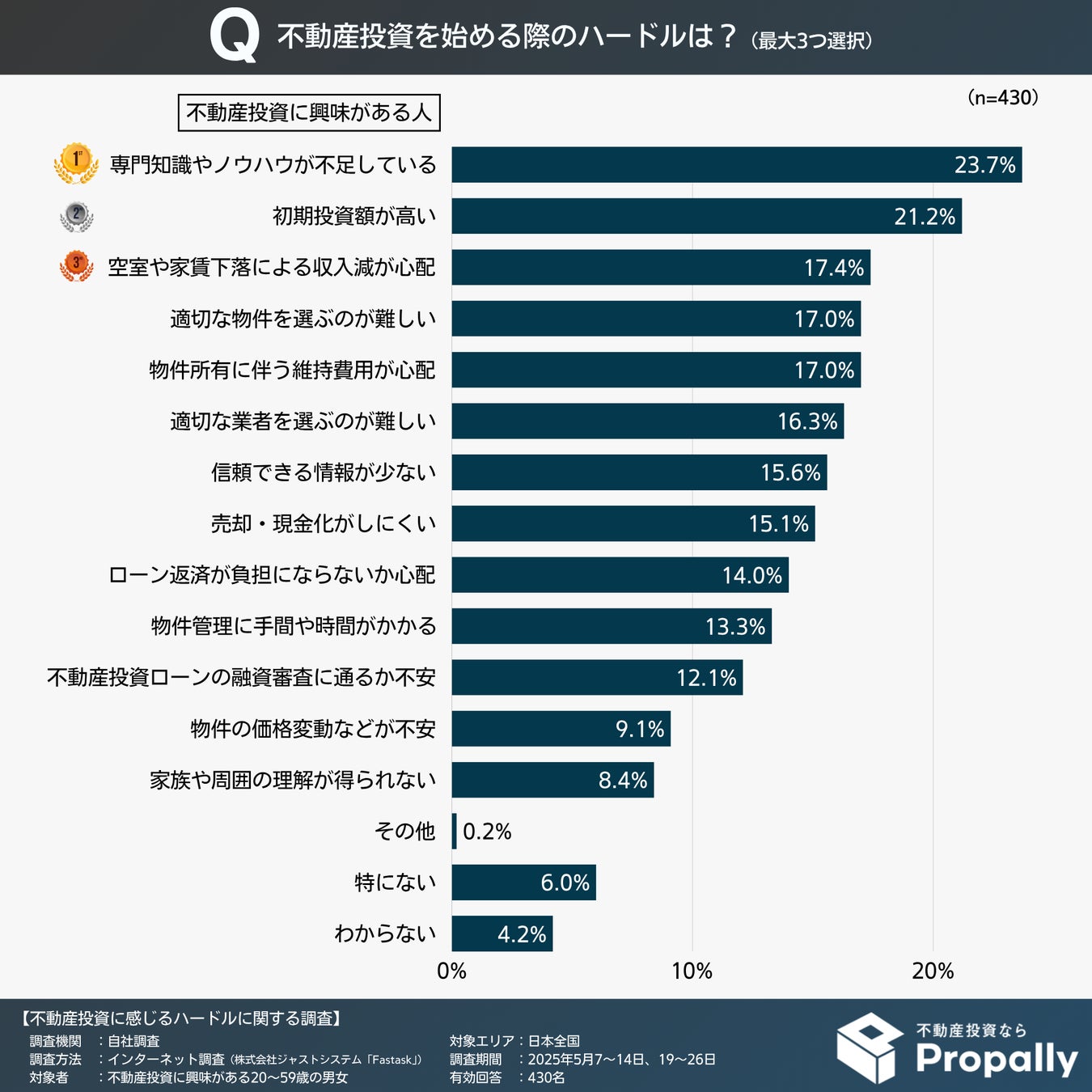 1.不動産投資のハードル、「専門知識やノウハウ不足」23.7%、「初期投資額が高い」21.2%が上位