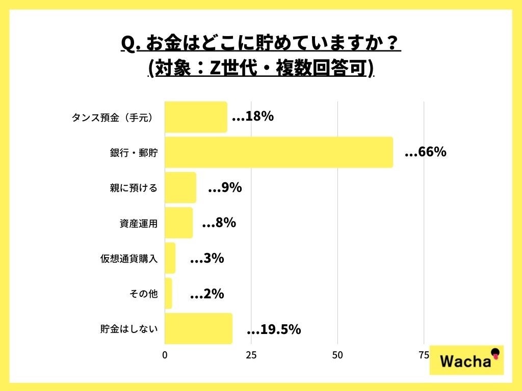 【Wacha調査レポート】Z世代の66%が貯めたお金は銀行に預けると回答。世代に関わらず、投資より貯蓄を好む傾向。