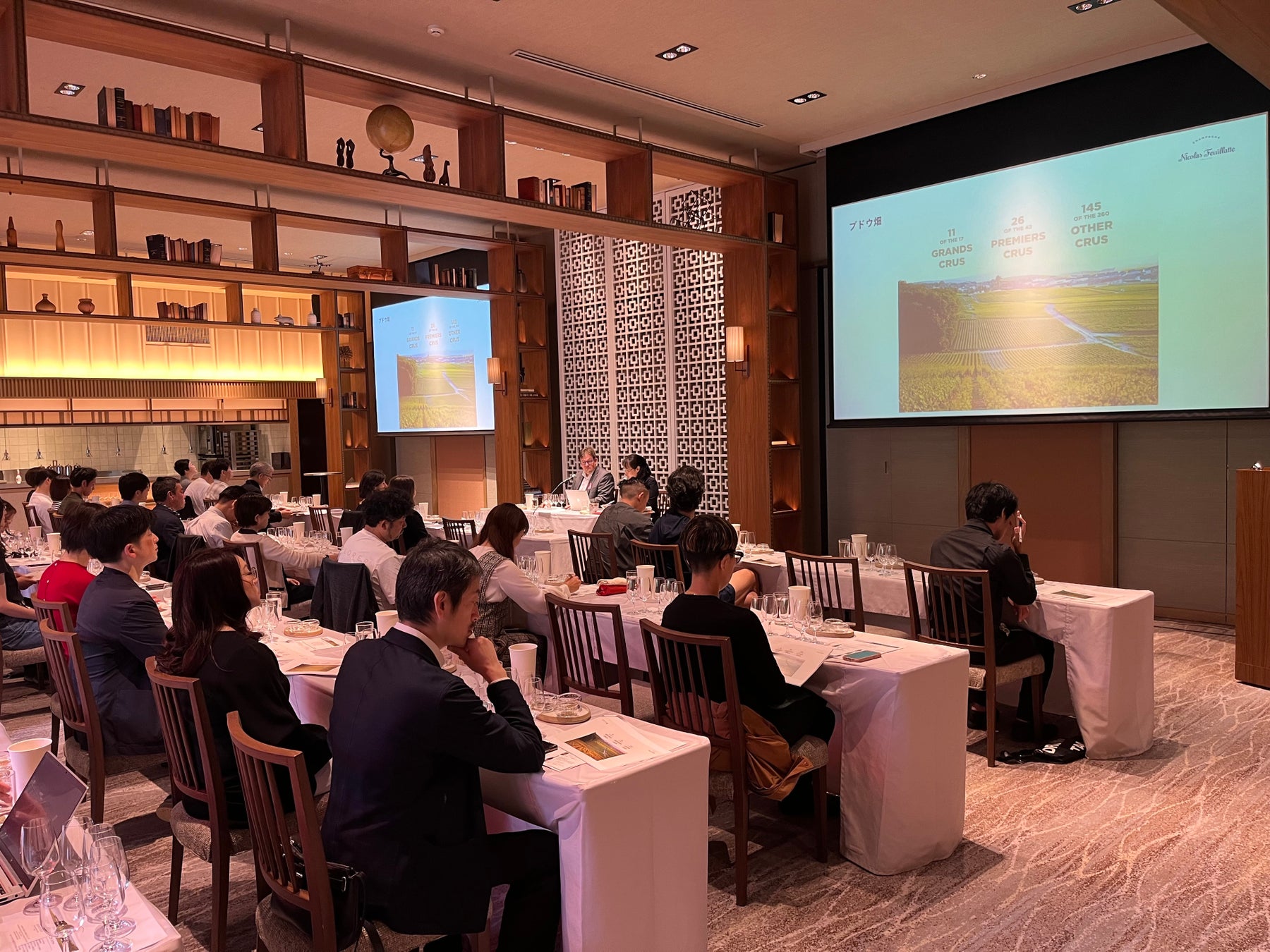 飲食業界関係者および有資格者向けに、東京、福岡とも各回50名限定のフラグシップシャンパーニュ「レゼルヴ・エクスクルーシヴ ブリュット」を含めた全6種類のテイスティングセミナーを開催し、ギョームが解説いたしました。東京では、パルムドール・ブリュットの新ヴィンテージとして2009年のキュヴェを世界で初めて業界のプロフェッショナル向けに紹介し、2008年ヴィンテージとの違いを説明しました。ギョームは、以下のように述べています。「2009年を2008年より前にリリースしているメゾンも多い中、ニコラ・フィアットは2009年が更に長期熟成に適していると考え、ヴィンテージ通りの順でリリースしました。今回このように紹介する機会をいただき光栄です。」日本マーケットでは、2025年より順次販売を予定しています。福岡では、フランスでも生産者の知識と技術向上のために行っている、“3種の胡椒とのペアリング”を交えながら試飲会を行いました。さらに、セミナーを通してギョームは、「日本は、シャンパーニュのマーケットに置いて非常に重要です。我々と同じ立場としての質問も多く、質疑応答は意義がある大変興味深い機会でした。」とコメントしました。
