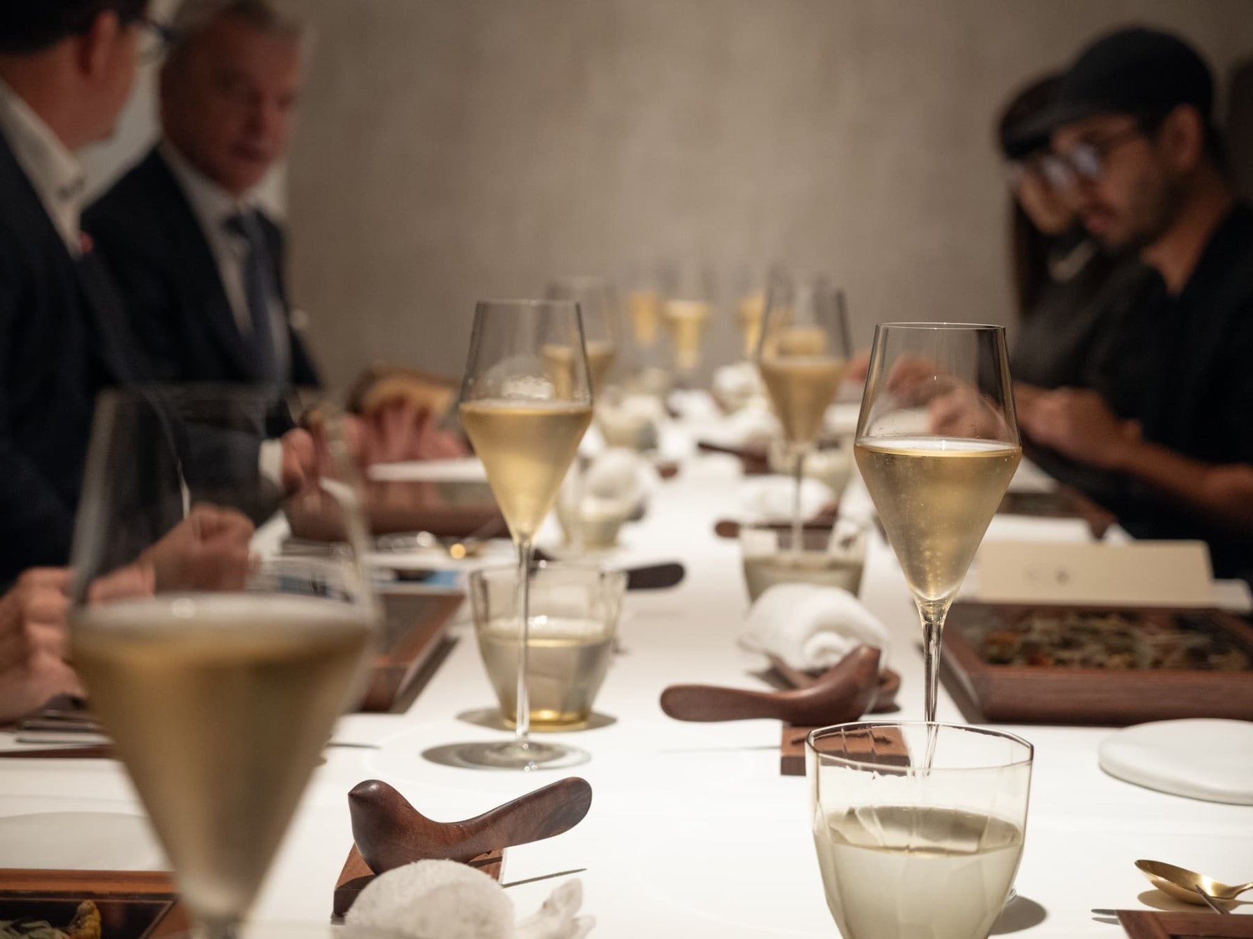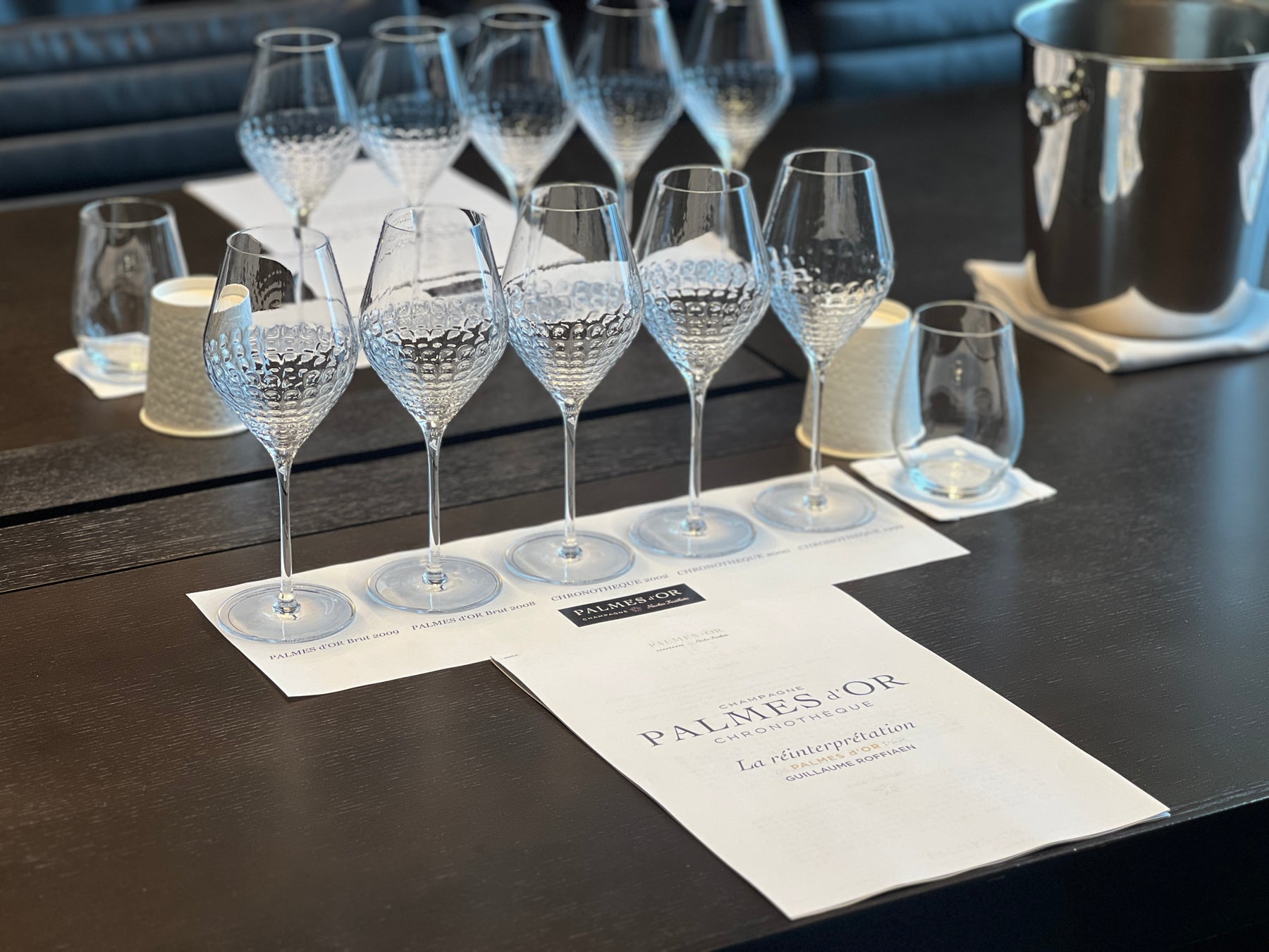 また、今回はソムリエおよびジャーナリストの方々向けに、20年瓶内熟成されたシャンパーニュ”クロノテーク”をテーマにしたセミナーも実施しました。それぞれのヴィンテージ合わせたドザージュを行っているため、必然的に生産できる本数が限られており、各ヴィンテージ(1999年、2000年、2002年)300本程度しか生産が見込まれておらず、現在、日本では“アマン東京”のみで販売される非常に貴重なキュヴェです。セミナーでは、パルム・ドールと比較しながら、製造時の基準や各ヴィンテージの特徴を解説しました。ギョームは「私は時間の深みの中で造られたクロノテークに対して、今までのパルム・ドールとは違った解釈をしており、前任者によって造られたものを最近のモダンスタイルに調整をしました。それぞれのヴィンテージには個性とコントラストがあり、非常に特徴的です。」と述べています。