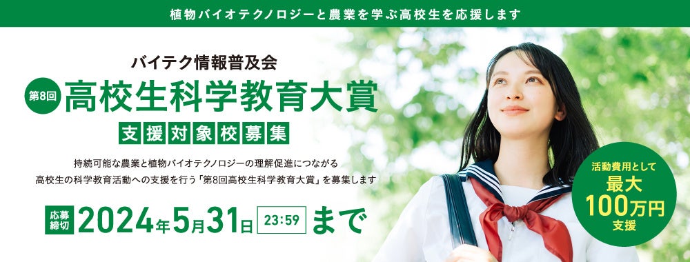 第8回となる本年も、農業と植物バイオテクノロジーへの理解が促進されるような研究、また遺伝子組み換え作物・ゲノム編集食品などに関するサイエンスコミュニケーション活動の計画やアイデアをお持ちの高校からのご応募をお待ちしております。